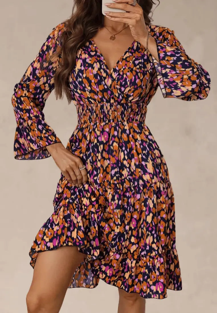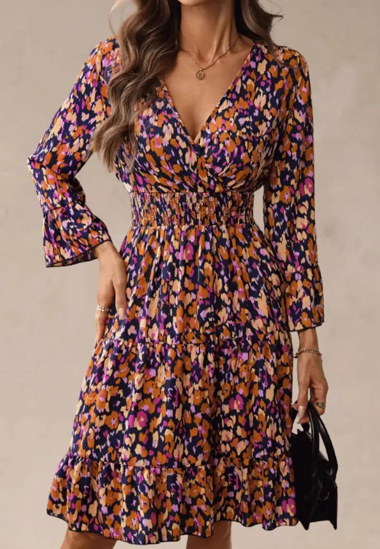 Fioletowo‑pomarańczowa sukienka kopertowa z wiązaniem w talii i długim rękawem