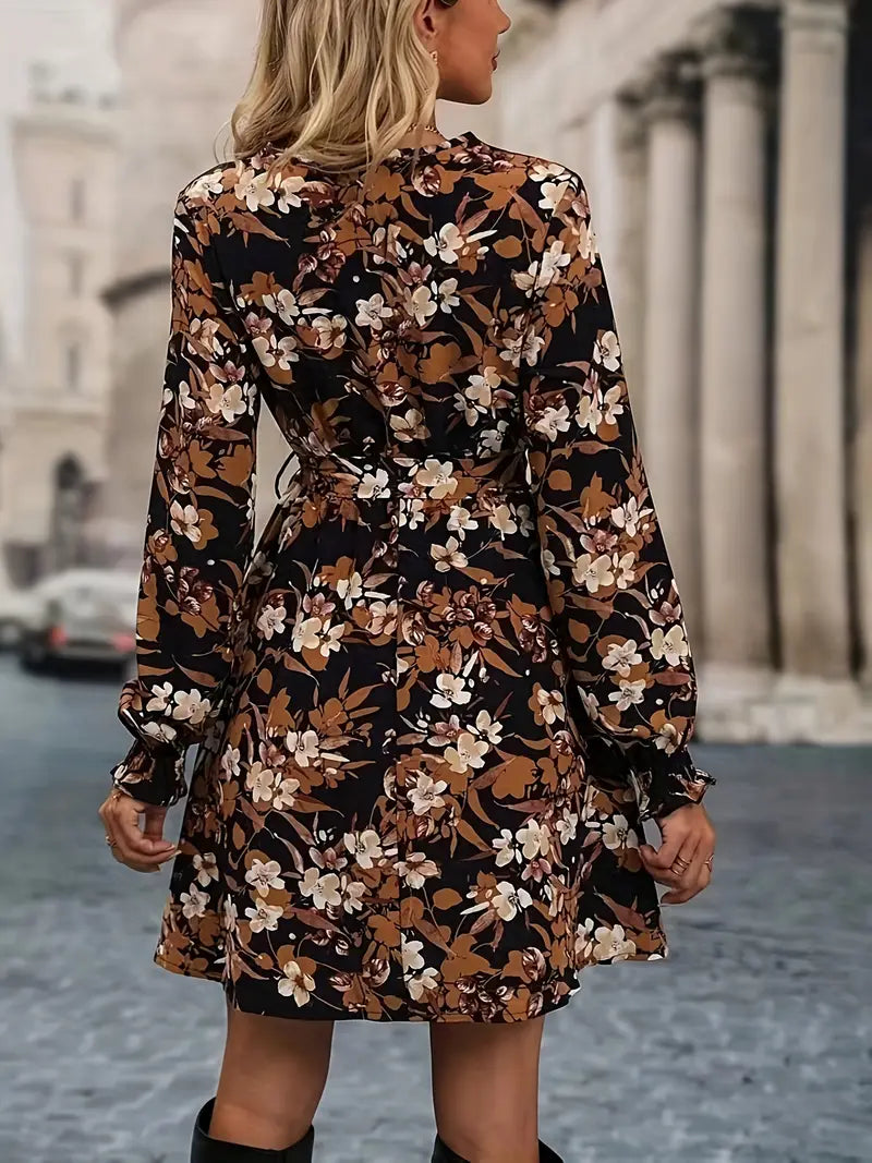 Sukienka kopertowa w kwiaty w odcieniach brązu i beżu