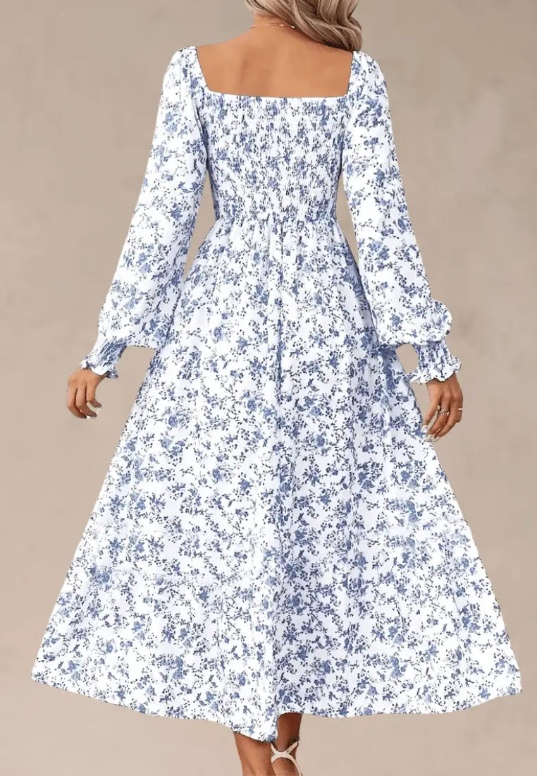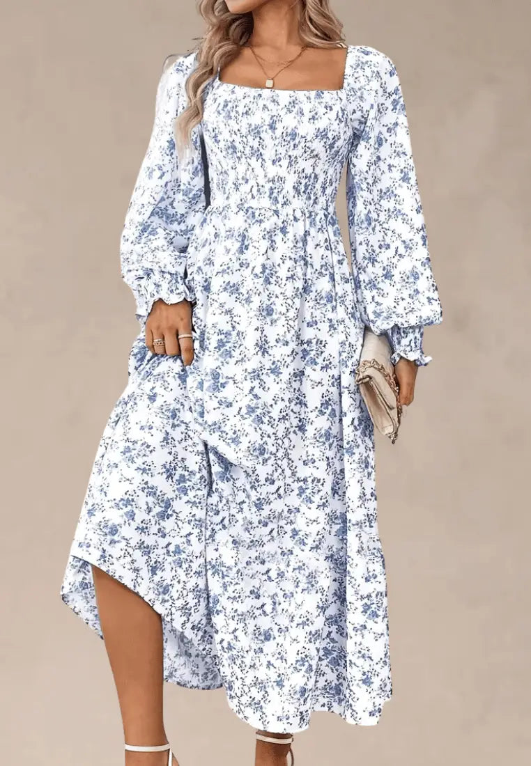 Biała sukienka maxi w niebieskie kwiaty z bufiastym rękawem