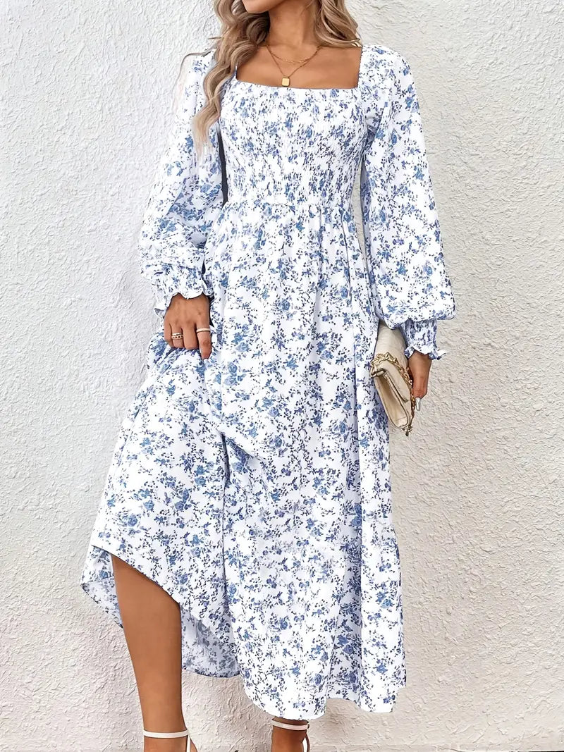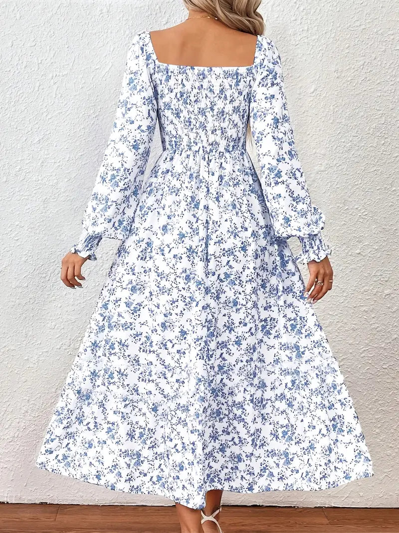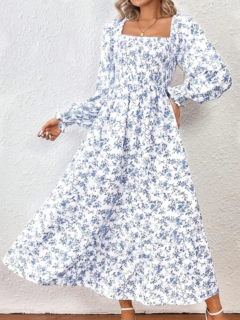 Sukienka maxi w niebieskie kwiaty z marszczeniem i długim rękawem