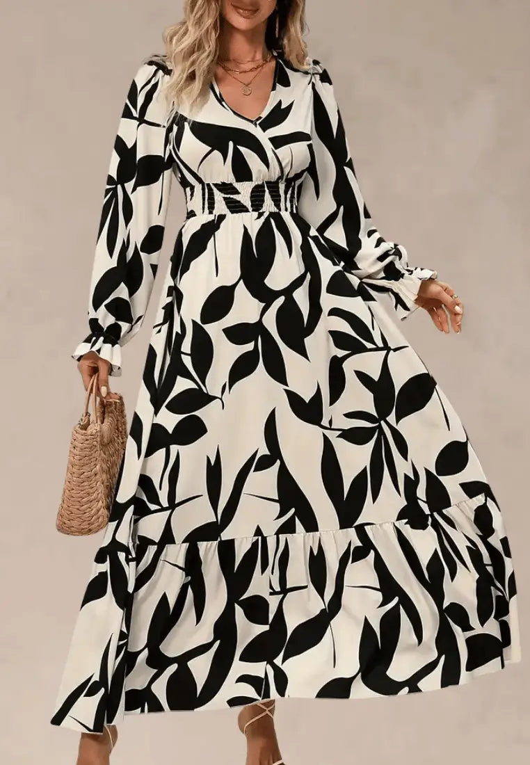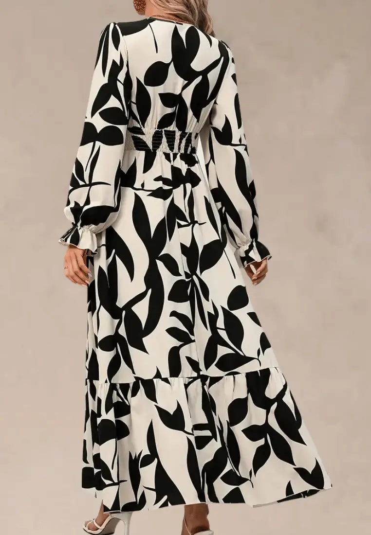 Model wyróżnia się kontrastowym, czarno-ecru wzorem inspirowanym motywami liści, który nadaje całości nowoczesnego i niebanalnego charakteru. Dopasowana góra z dekoltem w serek i elastyczne marszczenie w talii pięknie podkreślają kobiecą sylwetkę, a rozkloszowany dół z falbaną dodaje lekkości i elegancji. Długie rękawy zakończone gumką z delikatną falbanką wprowadzają subtelny, romantyczny akcent.