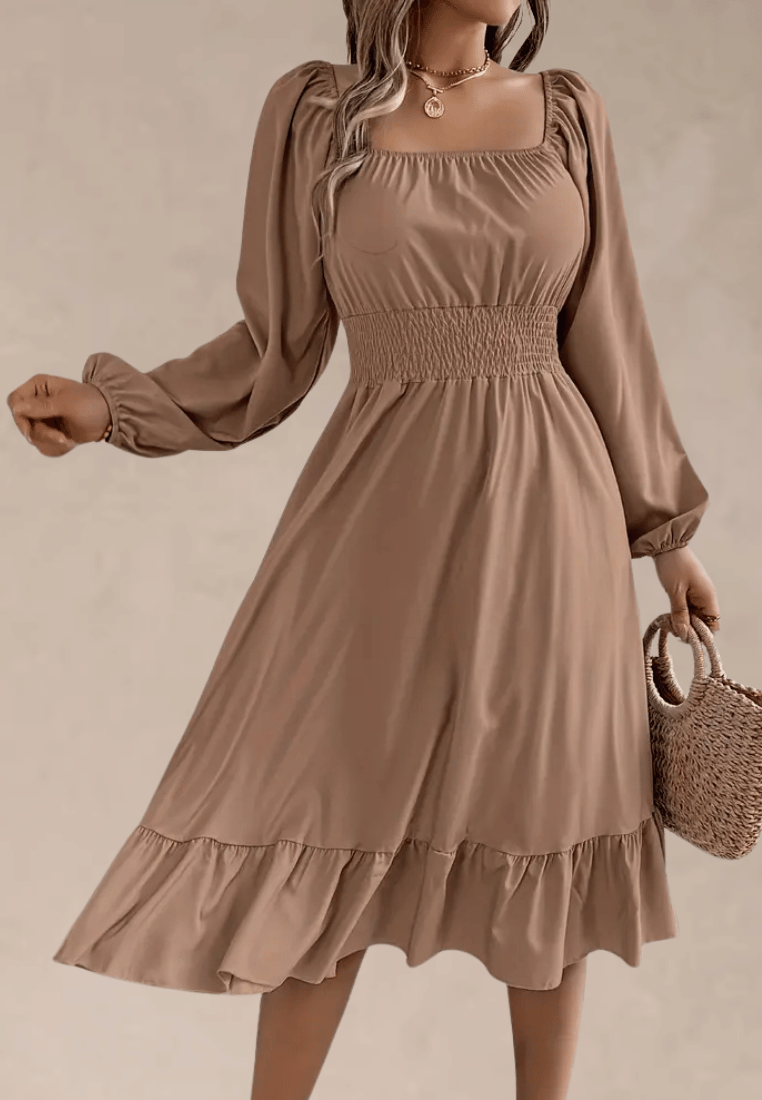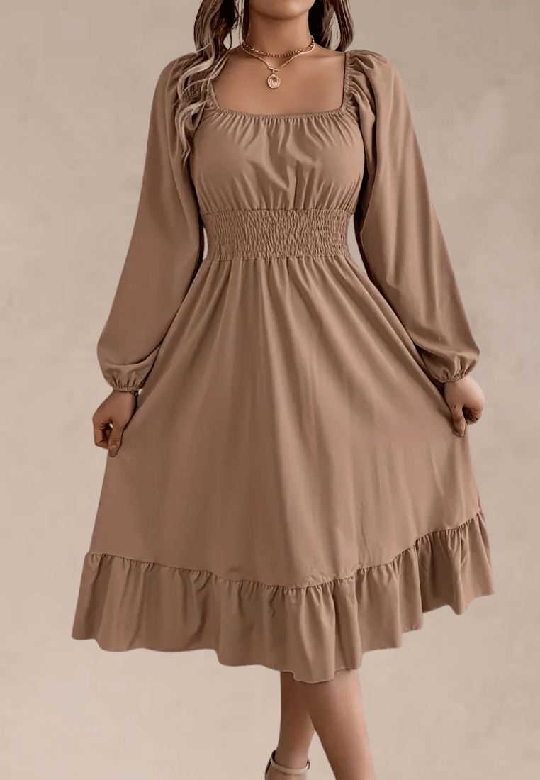 Poznaj definicję wygodnej kobiecości w nowym wydaniu – sukienka midi z długim rękawem i falbaną w karmelowym kolorze to połączenie prostoty, delikatności i ponadczasowego stylu. Jej gładki, jednolity odcień sprawia, że z łatwością dopasujesz ją do ulubionych dodatków, tworząc niezliczone stylizacje na różne okazje.