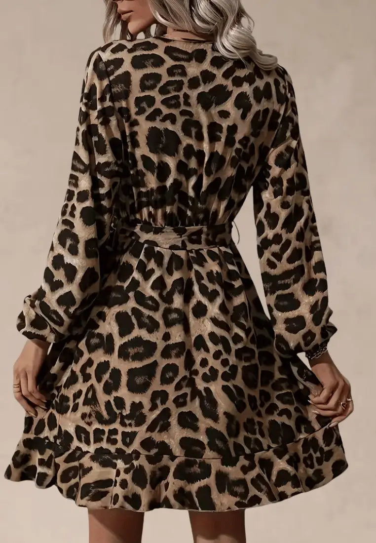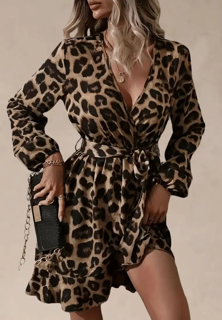 Brązowa sukienka panterkowa kopertowa z falbaną i długim rękawem
