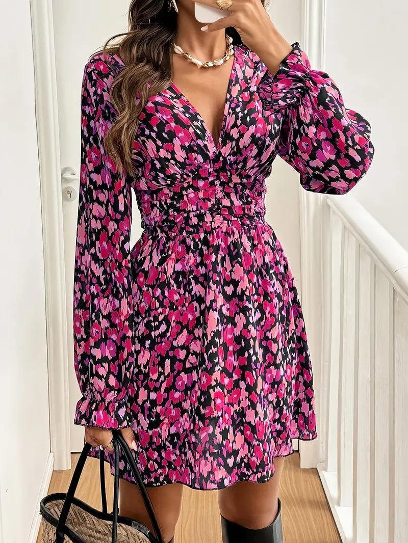 Model przyciąga wzrok oryginalnym wzorem w odcieniach fuksji, różu i czerni, który dodaje stylizacji charakteru. Marszczenie w talii delikatnie podkreśla sylwetkę, a głęboki dekolt w kształcie litery V wprowadza nutę zmysłowości. Długie rękawy zakończone lekkim falowaniem nadają sukience romantycznego wykończenia, a długość przed kolano sprawia, że sprawdzi się zarówno na co dzień, jak i podczas wyjątkowych okazji.