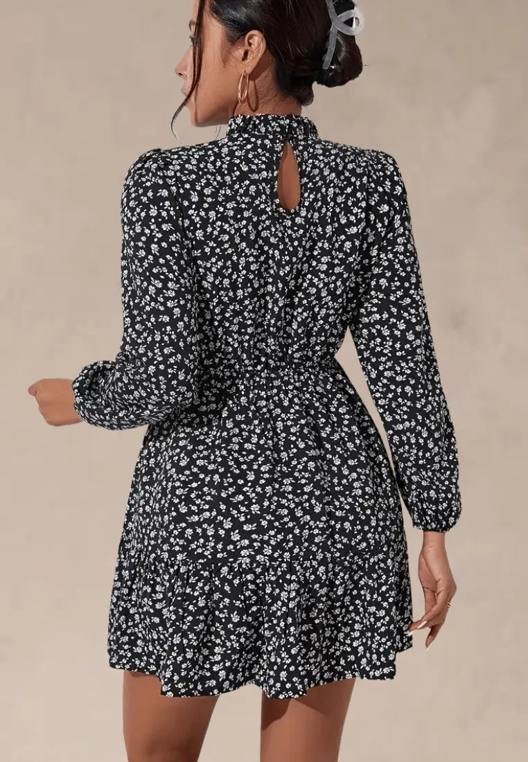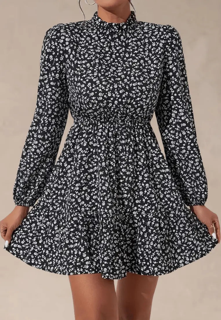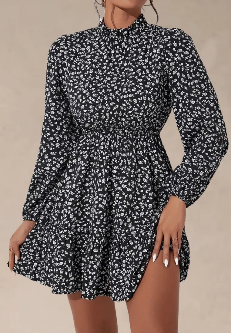 Drobny kwiatowy print na czarnym tle dodaje stylizacji romantycznego charakteru, a długość mini subtelnie eksponuje nogi. Wysoki kołnierz w połączeniu z długimi rękawami nadaje całości elegancji, a lekko rozkloszowany dół z marszczeniem w talii pięknie modeluje sylwetkę. Zapięcie na guziczek z tyłu dodaje praktycznego akcentu, a jednocześnie pozostaje niemal niewidoczne.