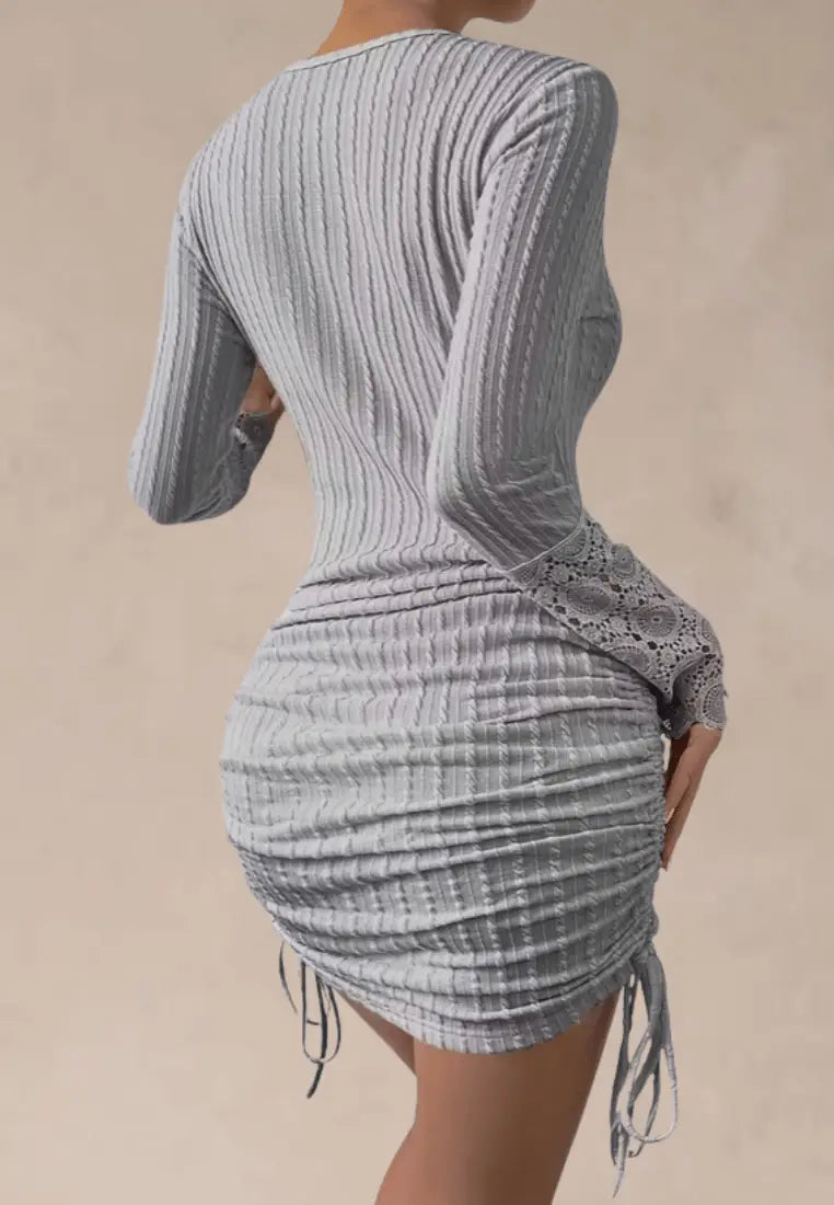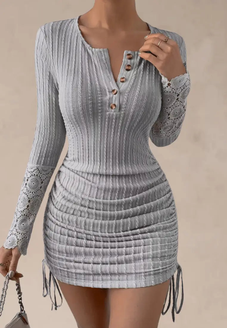 ✨ Sukienka szara prążkowana z koronkowymi rękawami
