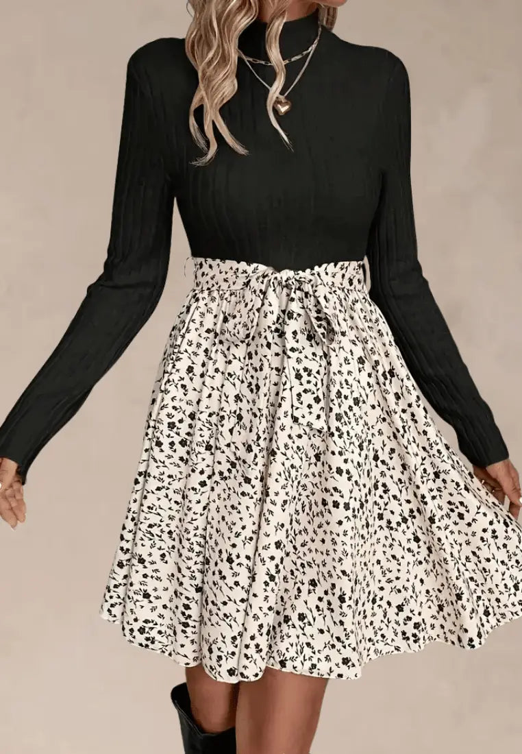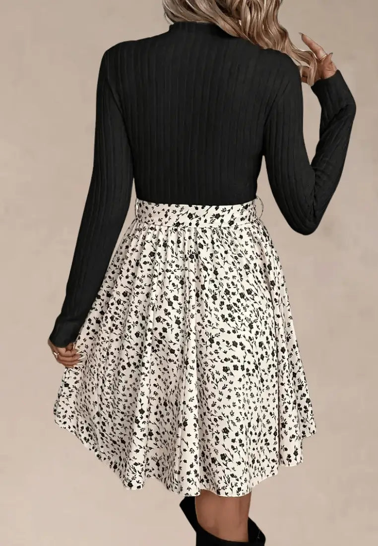 Czarna sukienka z prążkowaną górą i kremowym kwiatowym dołem