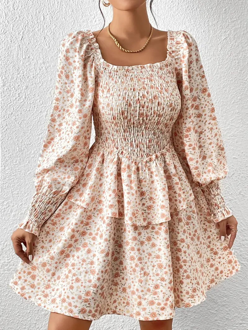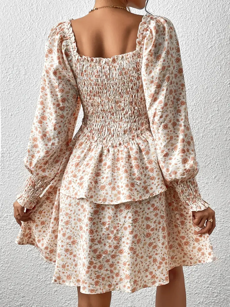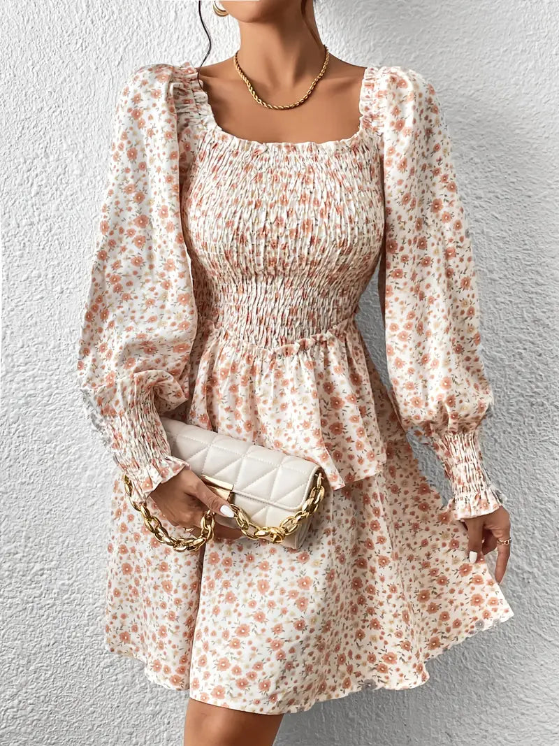 Sukienka w drobne kwiaty z marszczeniem i bufiastymi rękawami ecru