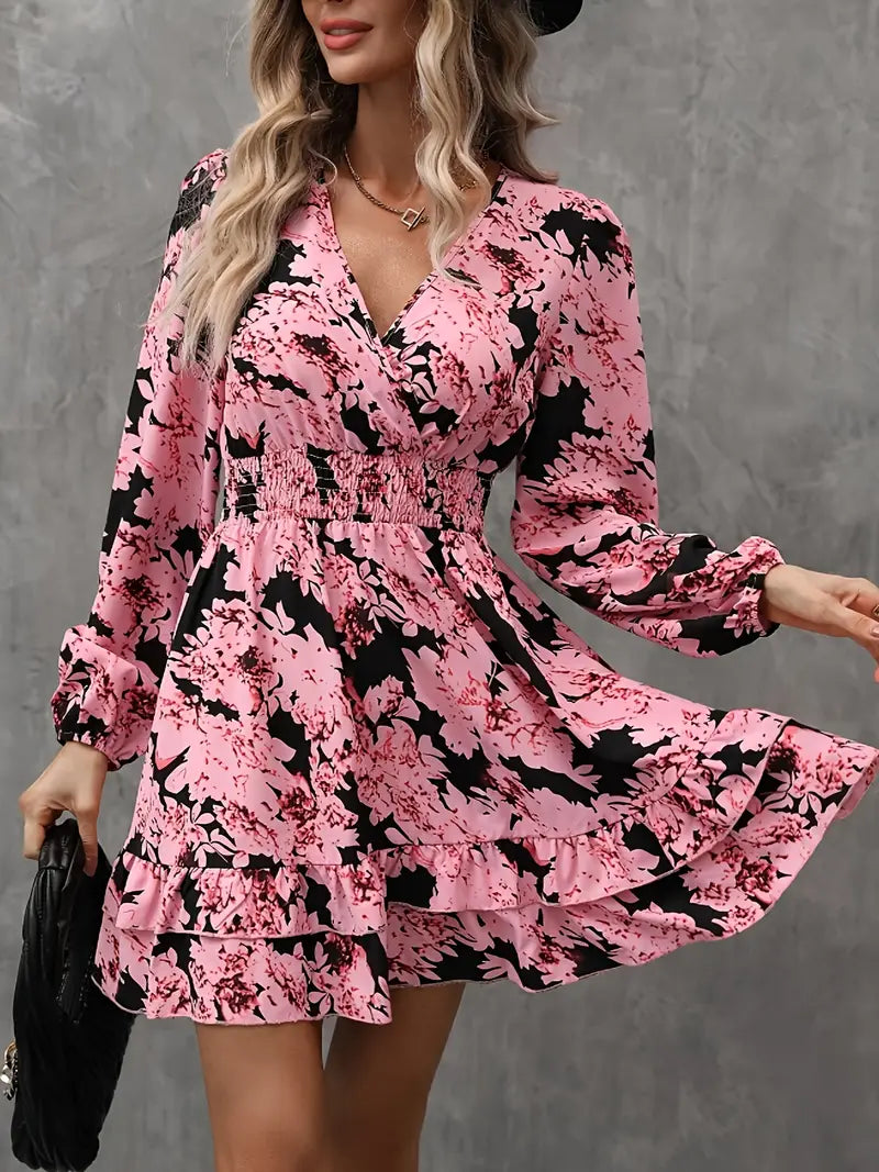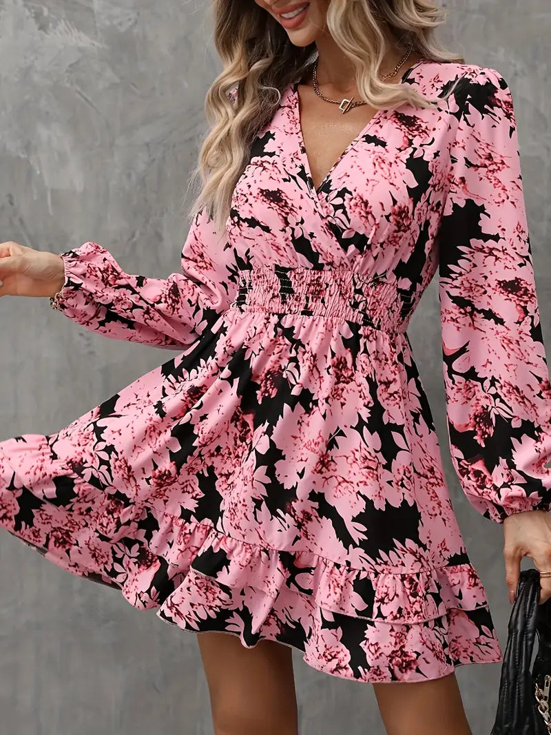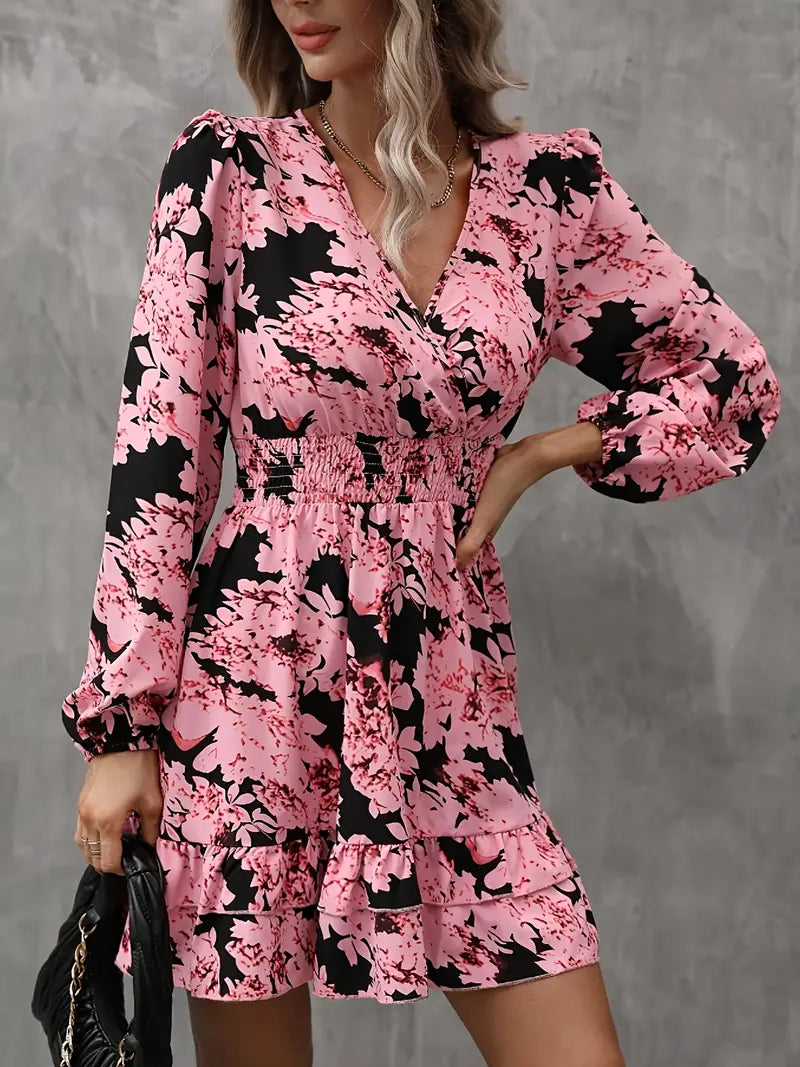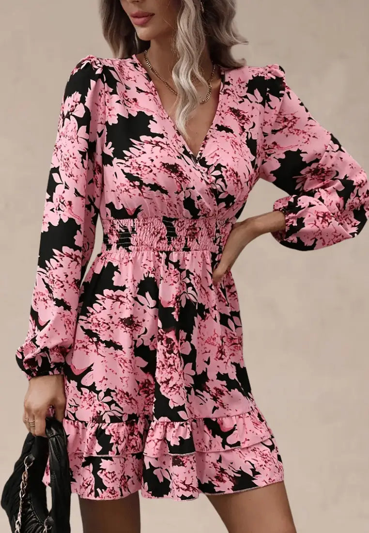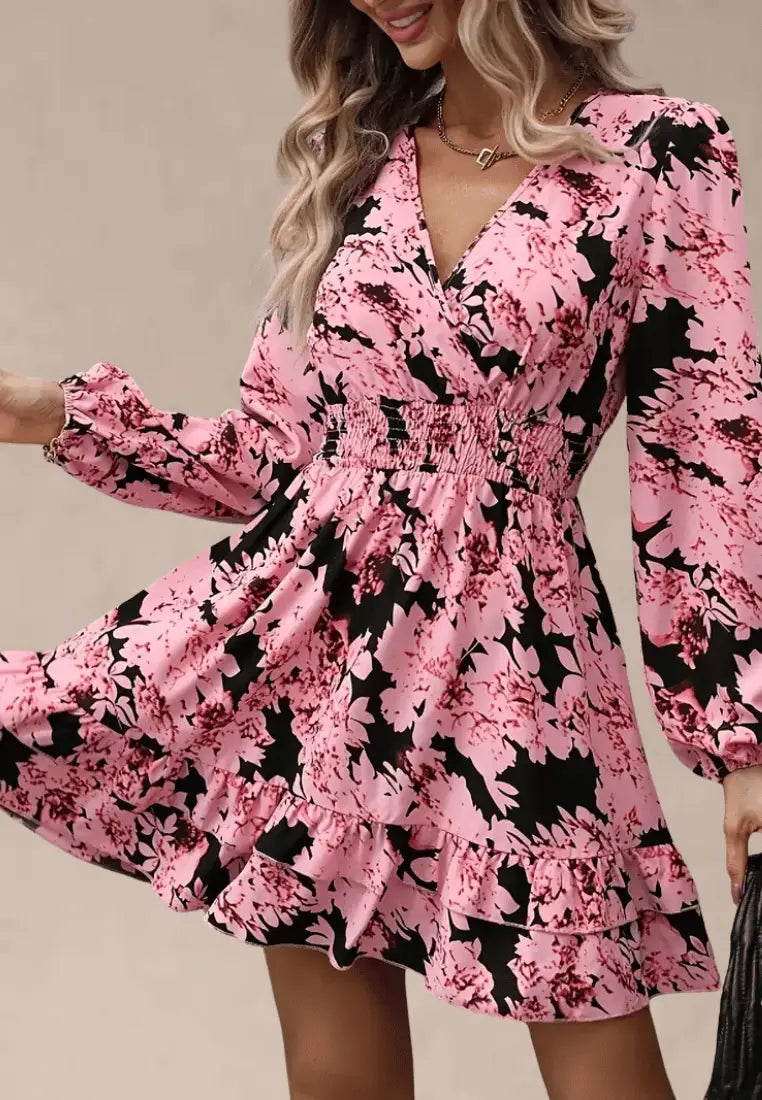 Model przyciąga wzrok intensywnym, kwiatowym wzorem w tonacjach różu i czerni, które tworzą harmonijną całość. Marszczenie w talii podkreśla figurę, a dekolt w kształcie litery V dodaje stylizacji subtelnej zmysłowości. Rękawy zakończone lekkim ściągaczem oraz dwuwarstwowa falbanka u dołu sukienki nadają całości delikatnego, romantycznego charakteru. Długość przed kolano sprawia, że sukienka świetnie sprawdzi się zarówno na co dzień, jak i na bardziej wyjątkowe okazje.