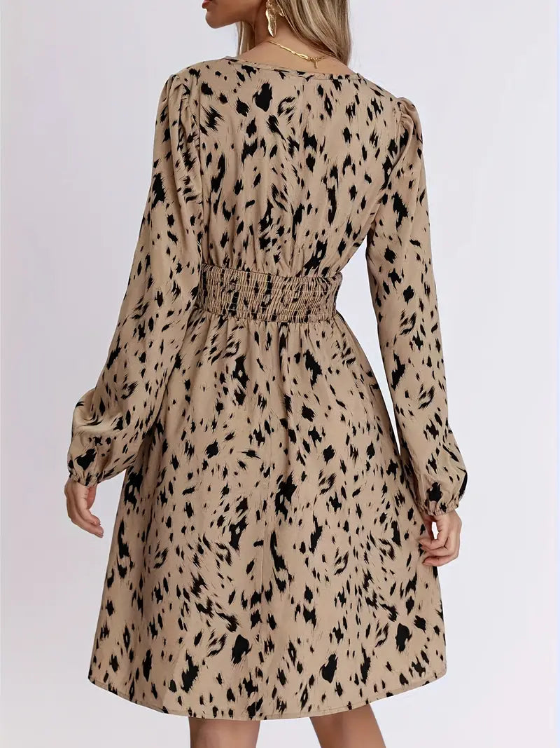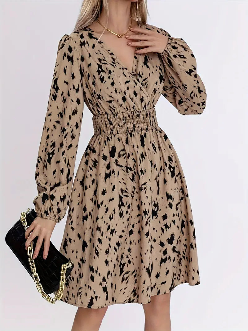 Sukienka z dekoltem kopertowym i elastyczną talią w beżowe cętki