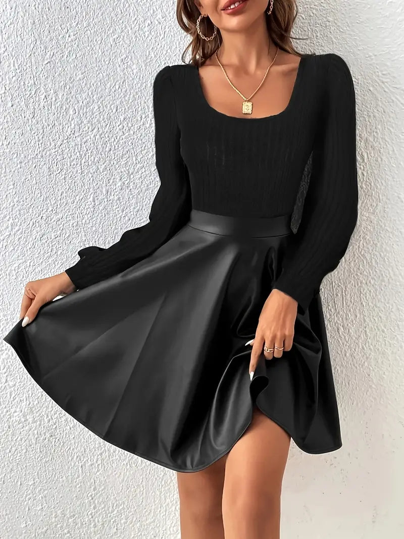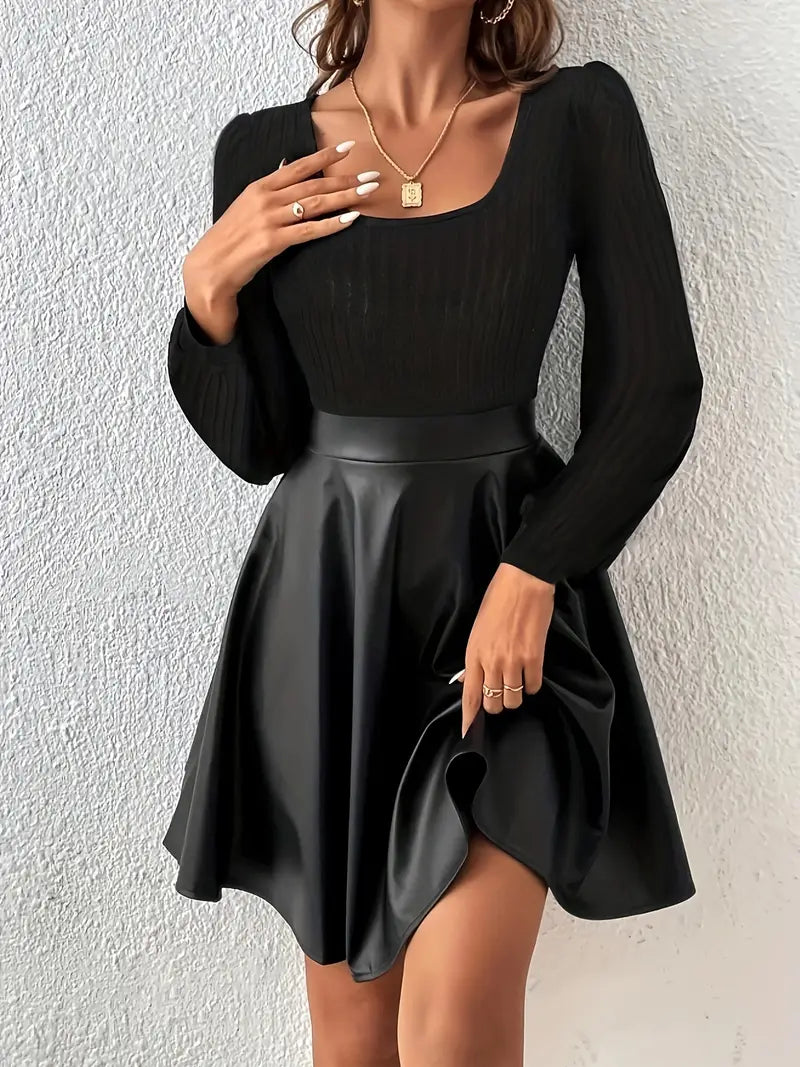 Sukienka z dzianinową górą i rozkloszowanym dołem z eko-skóry w kolorze czarnym