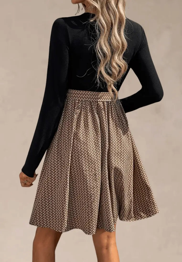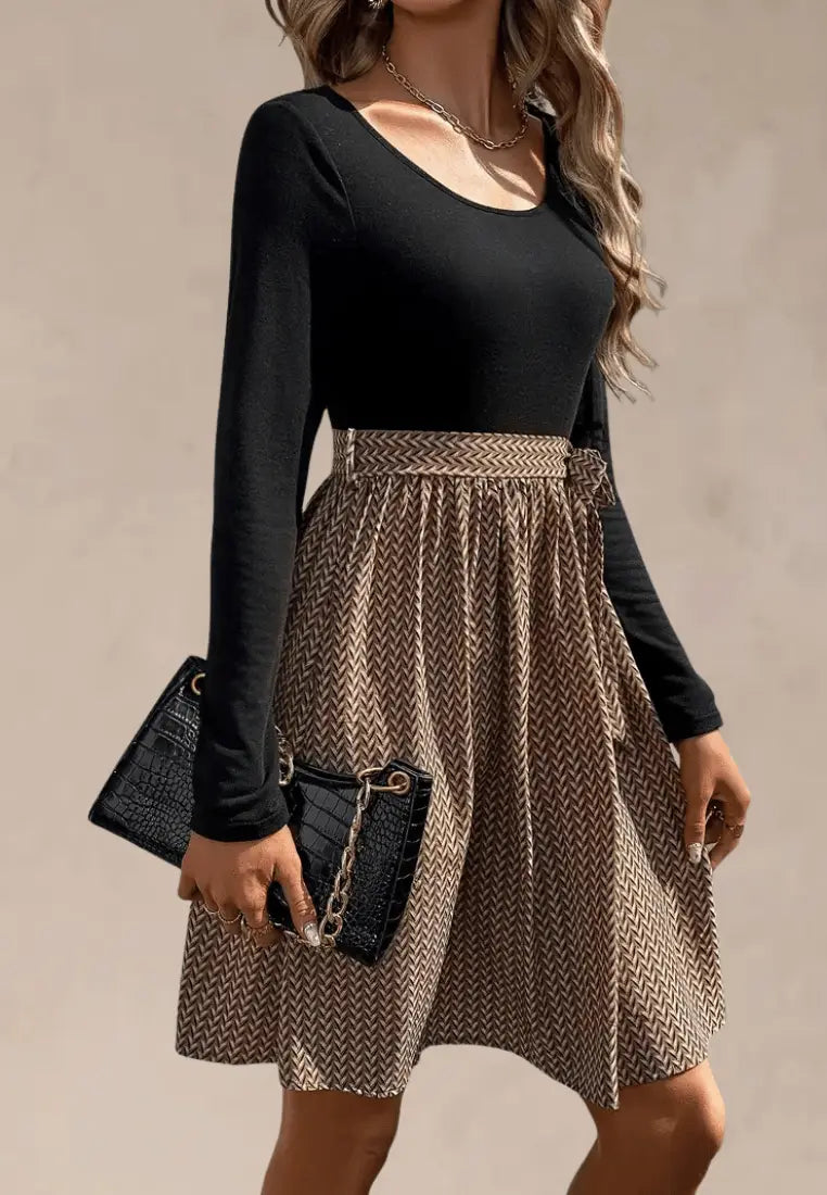 Dodaj swojej codziennej garderobie elegancji i wygody z wyjątkową sukienką z dzianinową górą i wzorzystym dołem z wiązaniem w talii. To połączenie klasyki i nowoczesności – dopasowana czarna góra z długim rękawem zapewnia komfort i wysmukla sylwetkę, natomiast rozkloszowany dół w geometryczny wzór nadaje stylizacji charakteru i lekkości.
