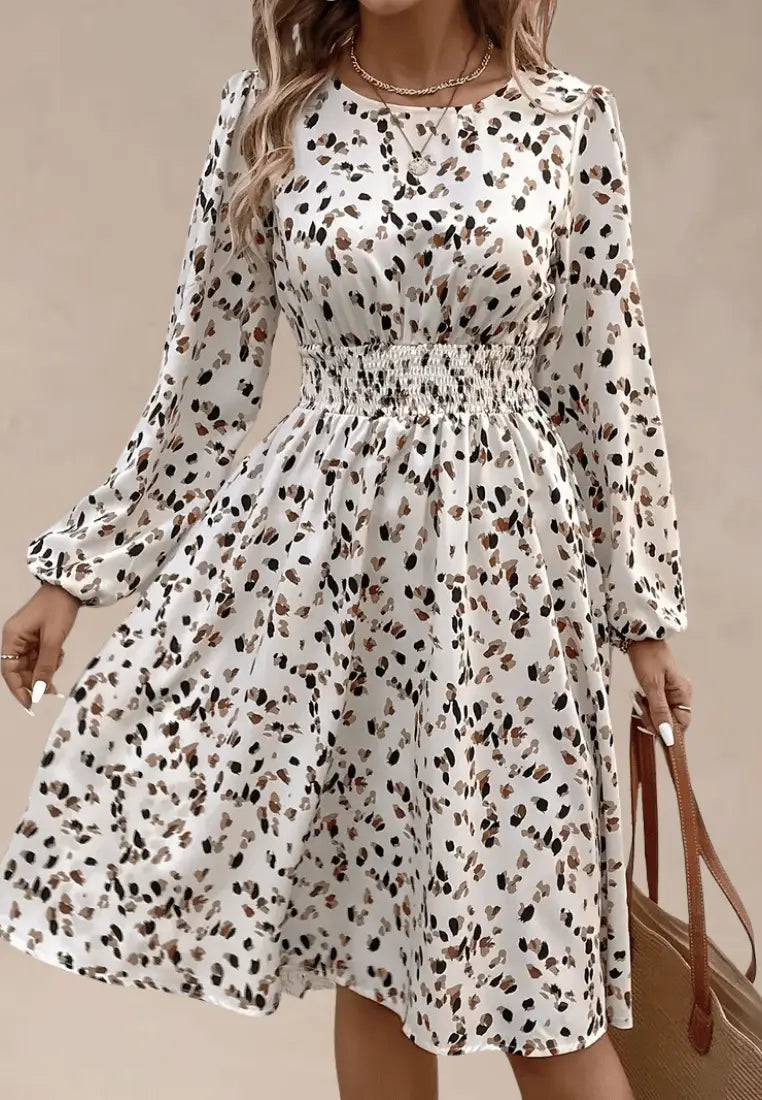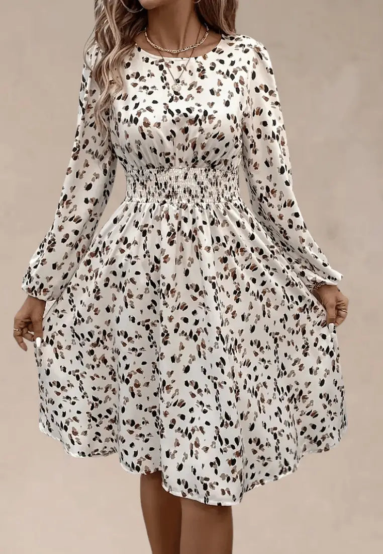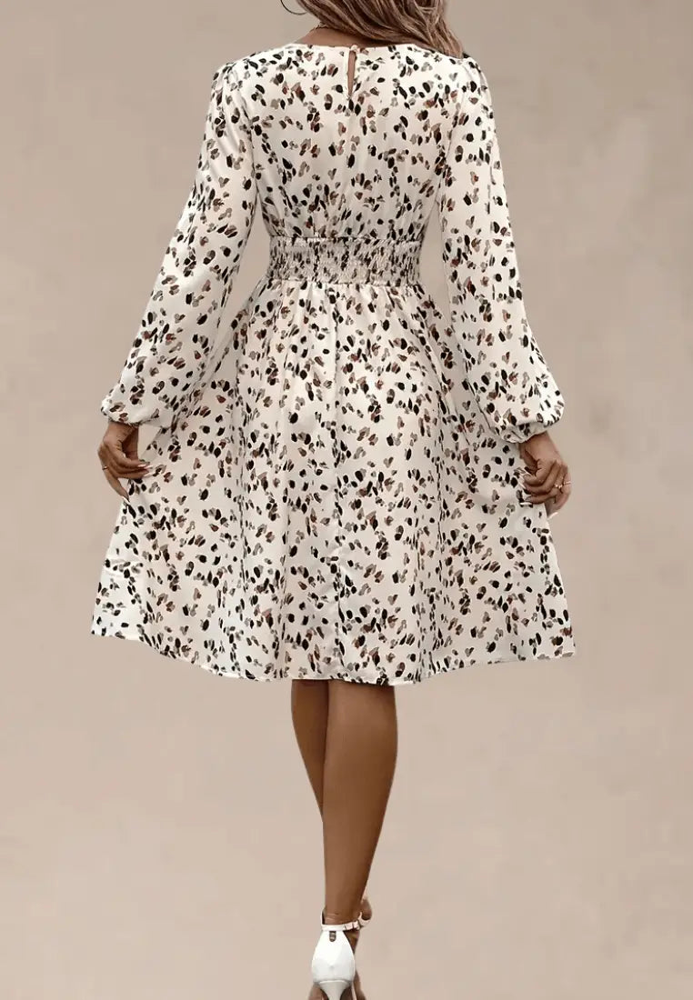 Kremowa sukienka z gumką w talii panterkowy wzór midi fason