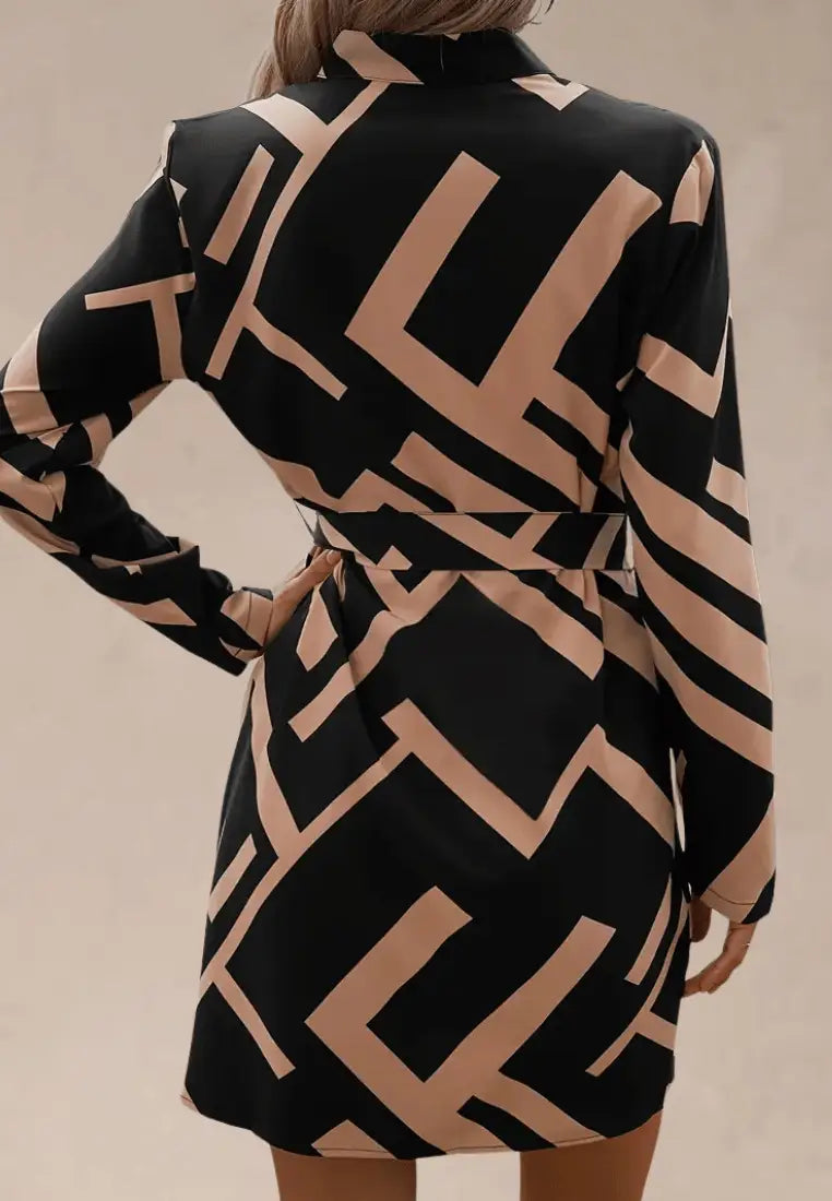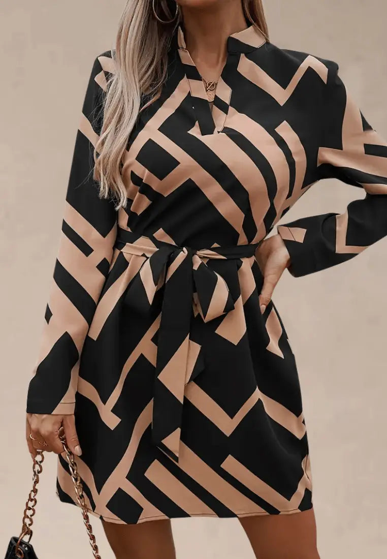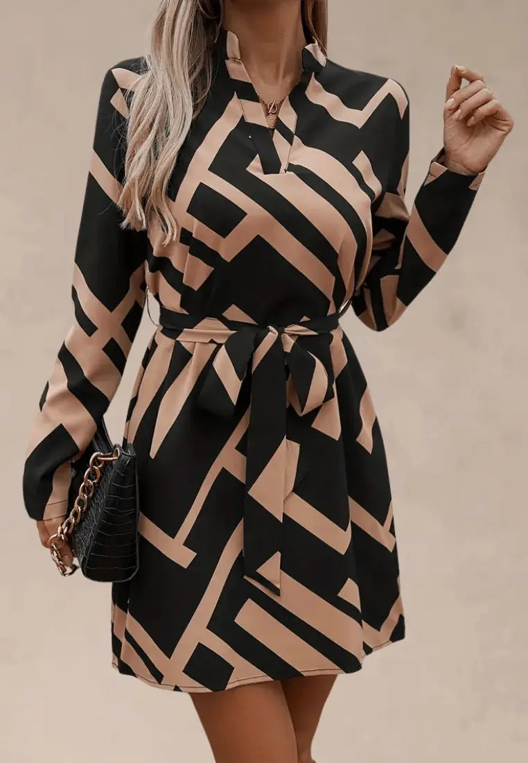 Beżowo-czarna sukienka z geometrycznym wzorem i paskiem