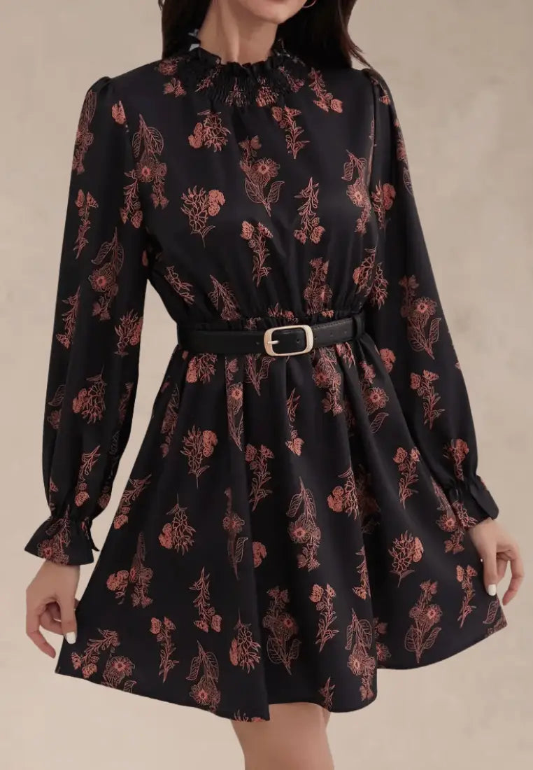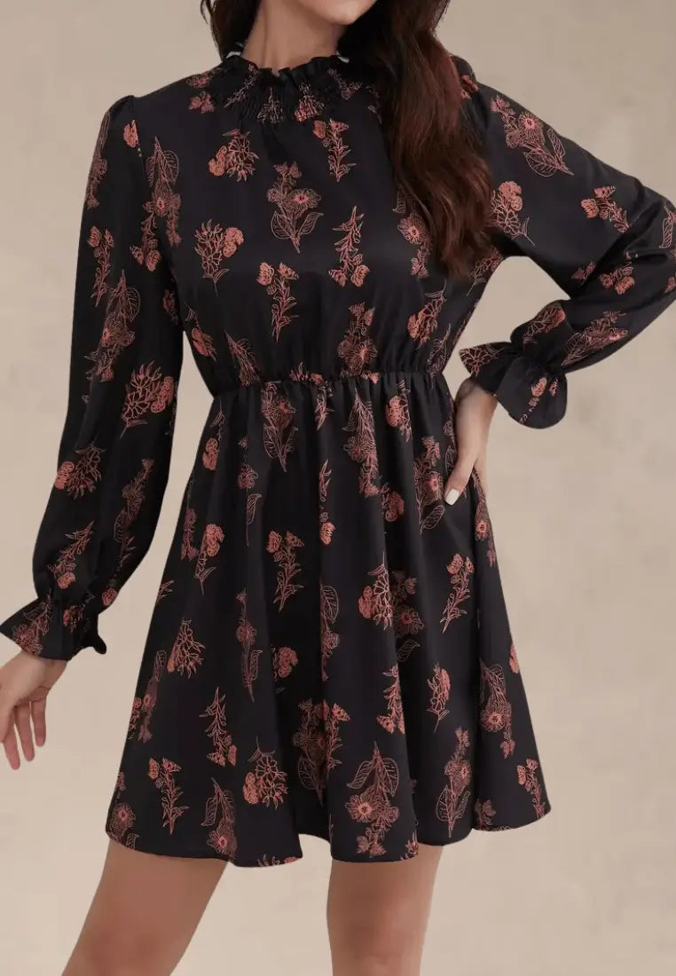 Sukienka została uszyta z lekkiego, przyjemnego w dotyku materiału, który miękko opływa ciało. Czarną bazę zdobi delikatny kwiatowy print w odcieniach miedzi i brzoskwini, nadający całości subtelnego, romantycznego wyrazu. Elastyczna talia pięknie zaznacza kobiecą figurę, a marszczona stójka i długie rękawy zakończone falbanką dodają stylizacji szyku i elegancji. Krój przed kolano sprawia, że sukienka doskonale sprawdzi się zarówno na co dzień, jak i podczas bardziej formalnych okazji.