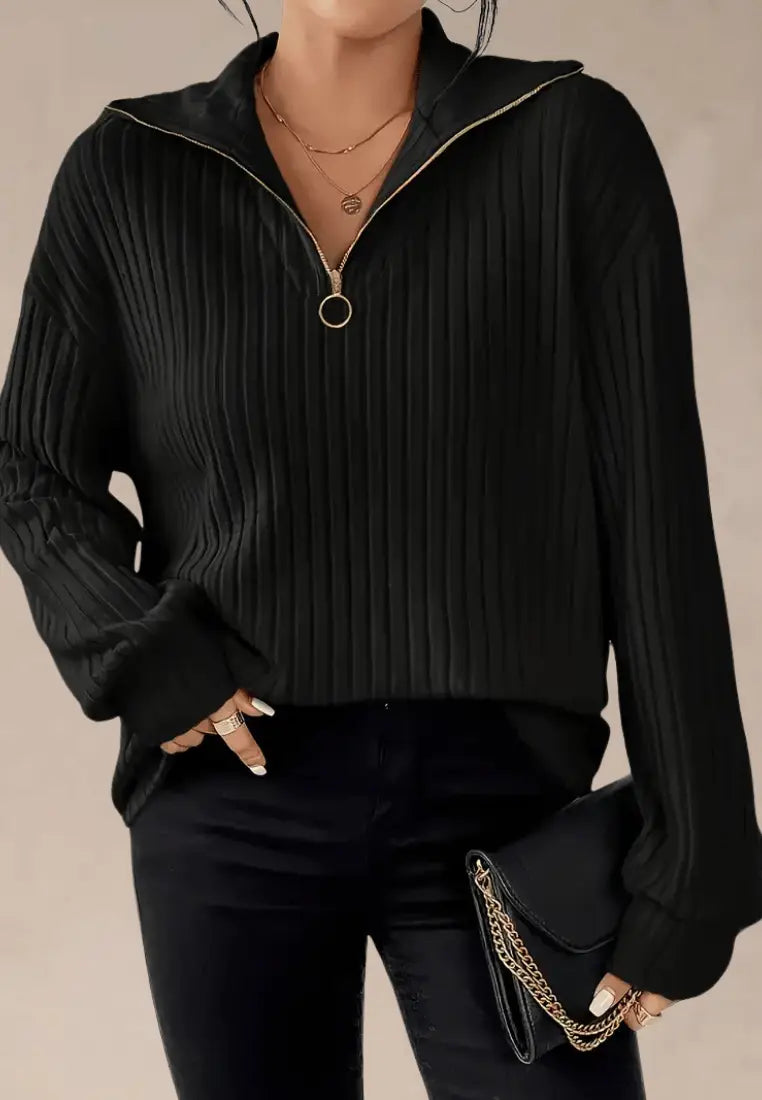 Czarny sweter damski prążkowany z zamkiem i kołnierzem