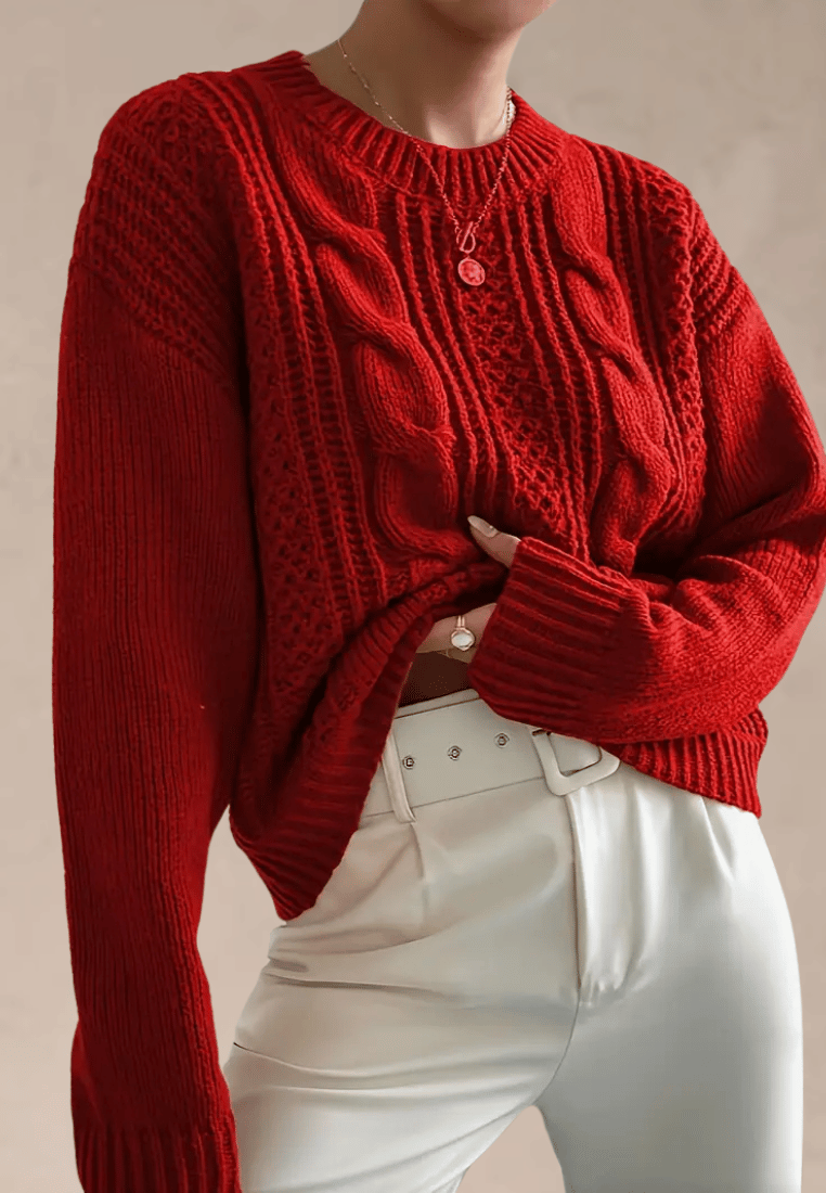 Czerwony sweter damski z grubym splotem i warkoczowym wzorem