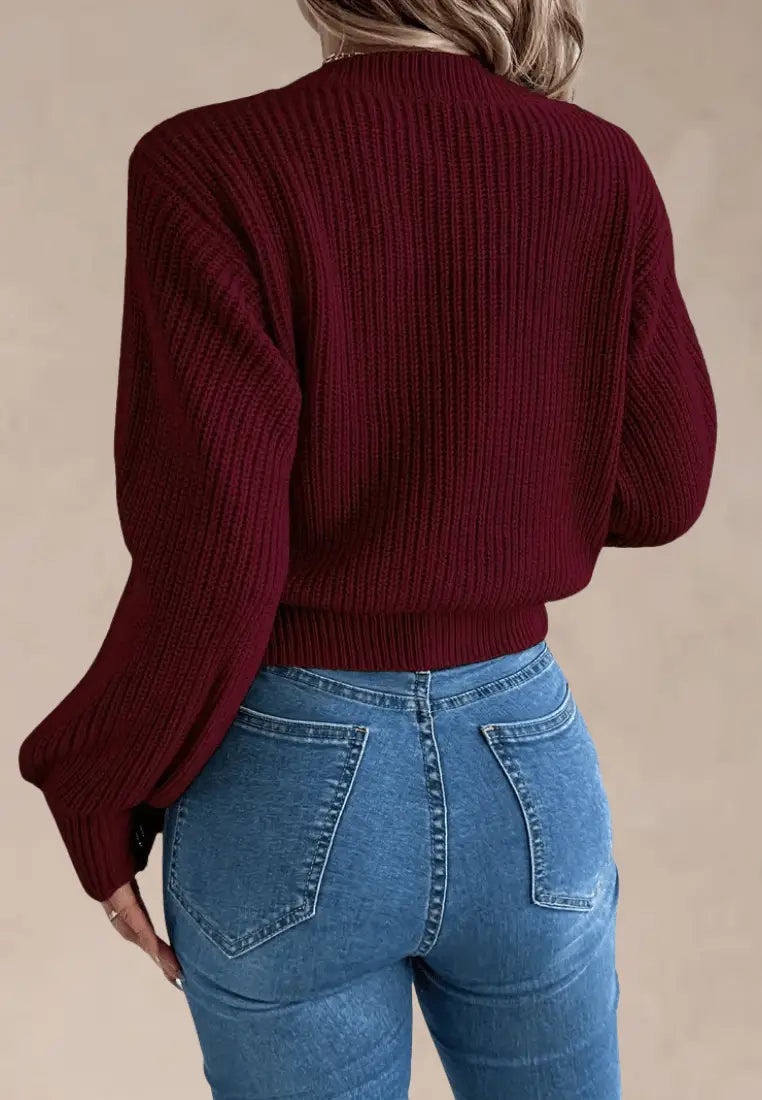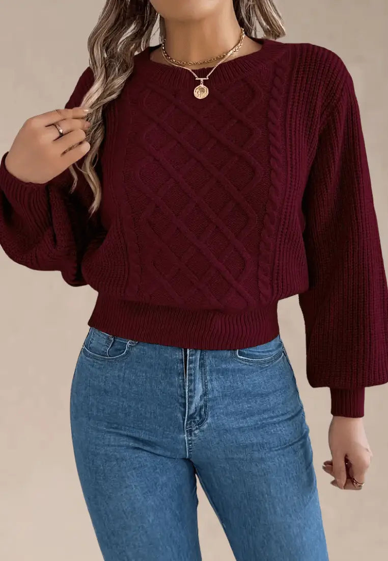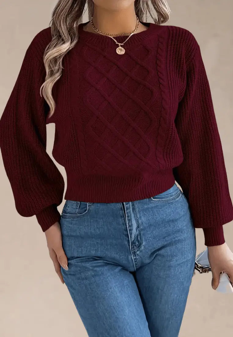 Postaw na ponadczasową elegancję w jesienno-zimowym wydaniu z burgundowym swetrem o efektownym warkoczowym splocie. Jego głęboki, winny odcień dodaje stylizacji klasy i wyrazistości, a miękki, grubszy materiał otula ciepłem w chłodniejsze dni.