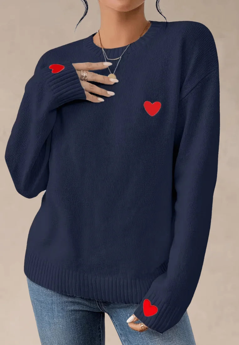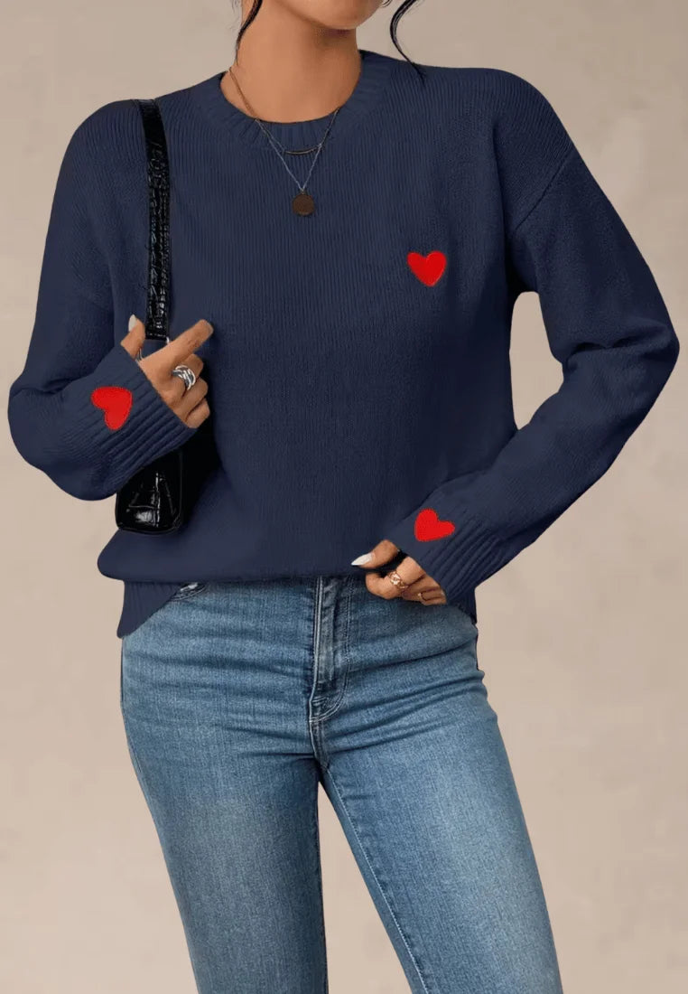 Granatowy sweter damski z czerwonymi serduszkami na piersi i rękawach