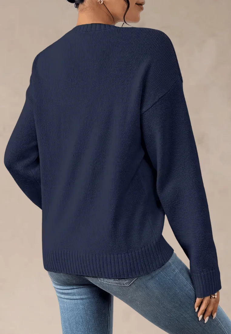 Ten granatowy sweter damski z czerwonymi serduszkami na piersi i rękawach doskonale sprawdzi się zarówno do jeansów, jak i eleganckich spodni czy spódnic. To połączenie prostoty i kobiecości, które podkreśla styl i delikatność w jednym. Idealny na co dzień, do pracy lub romantyczny spacer.