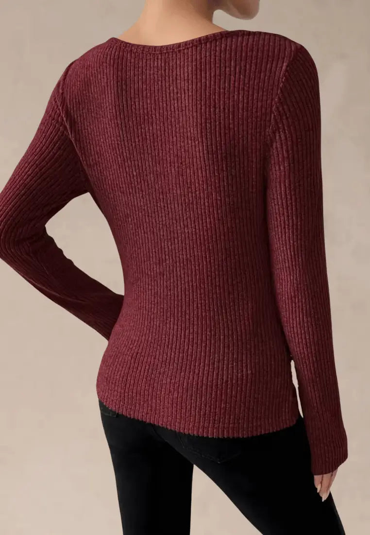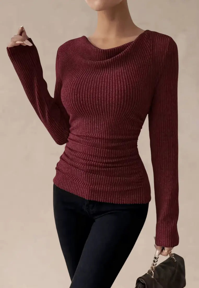 Ten sweter prążkowany z marszczeniem i szerokim dekoltem w kolorze bordowym sprawdzi się zarówno na co dzień, jak i w eleganckich stylizacjach — doskonale wygląda z jeansami, spódnicą czy eleganckimi spodniami.