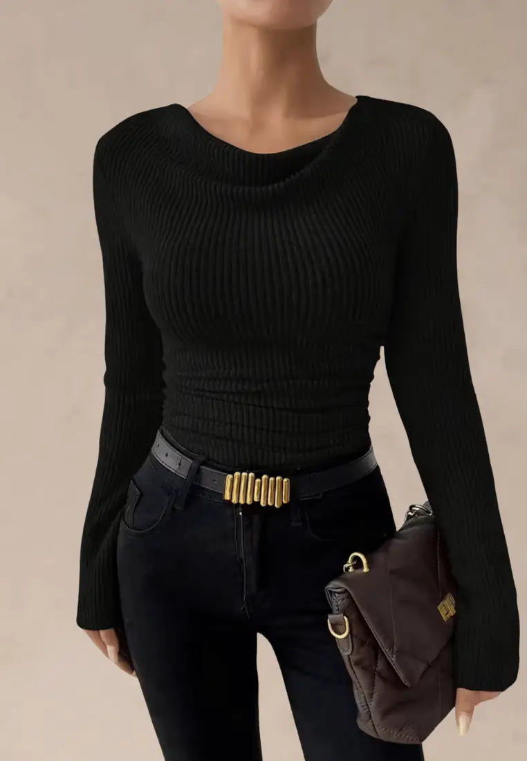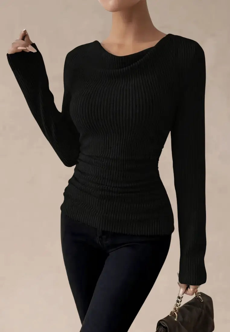 Elegancki sweter prążkowany z marszczeniem w kolorze czarnym to propozycja dla kobiet ceniących minimalizm i klasę. Wykonany z miękkiej, elastycznej dzianiny, doskonale dopasowuje się do sylwetki, podkreślając kobiece kształty. Delikatne marszczenie w talii optycznie wysmukla figurę, a subtelny dekolt typu cowl dodaje całości wyjątkowej lekkości.