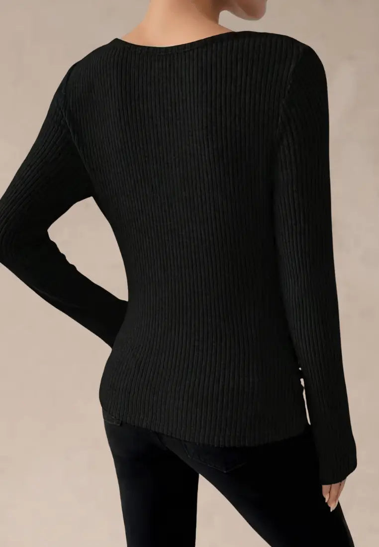 Czarny sweter damski prążkowany z dekoltem woda