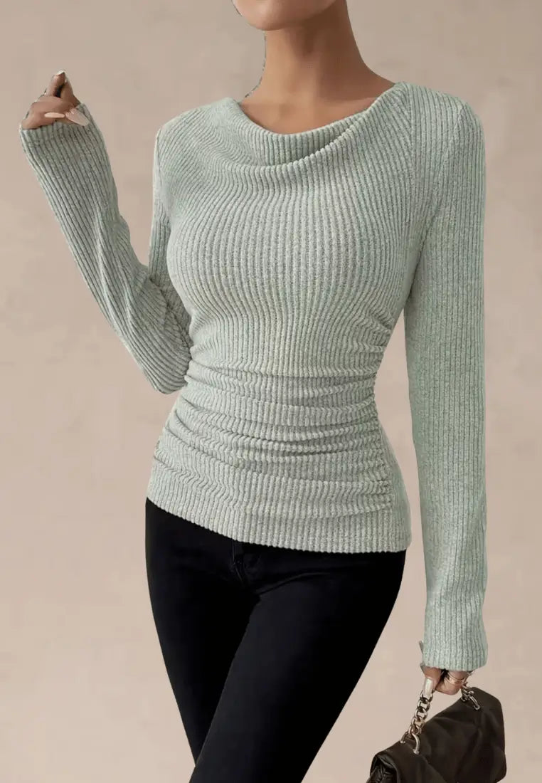 Stylowy sweter prążkowany z marszczeniem w kolorze szarym to połączenie wygody, klasy i subtelnej elegancji. Wykonany z miękkiej dzianiny o elastycznej strukturze, pięknie dopasowuje się do sylwetki, podkreślając kobiece kształty. Delikatne marszczenie w talii optycznie modeluje figurę, a szeroki dekolt typu cowl dodaje całości lekkości i zmysłowego charakteru.
