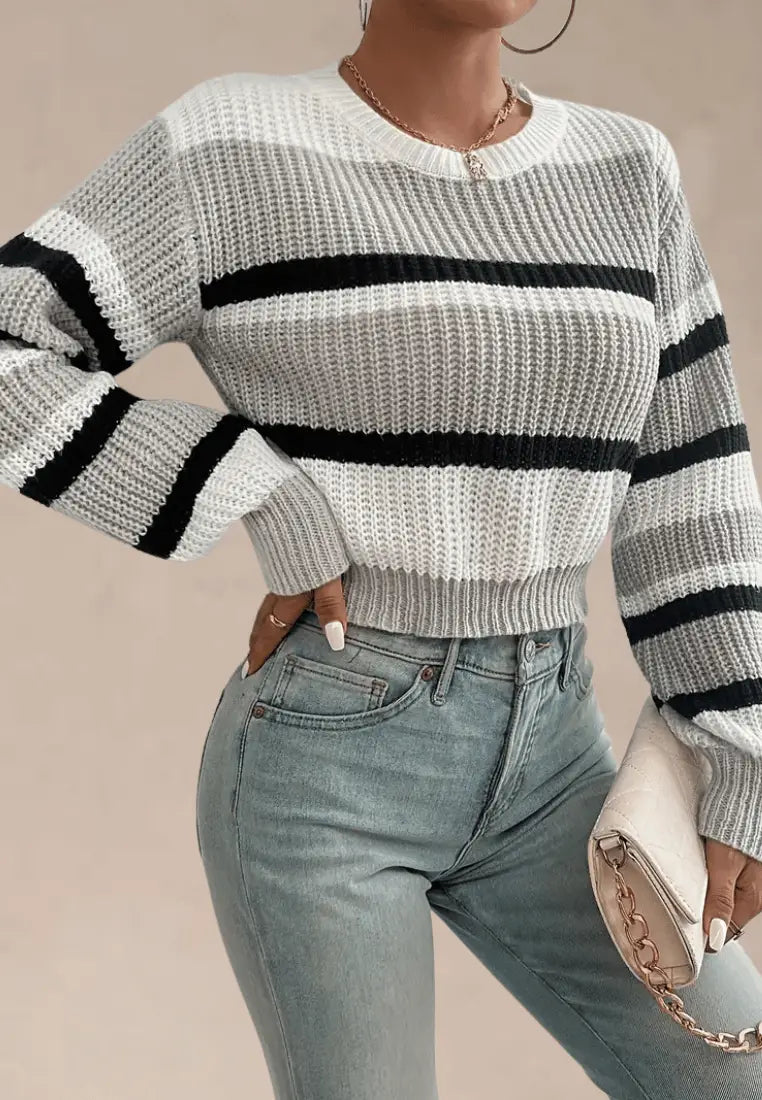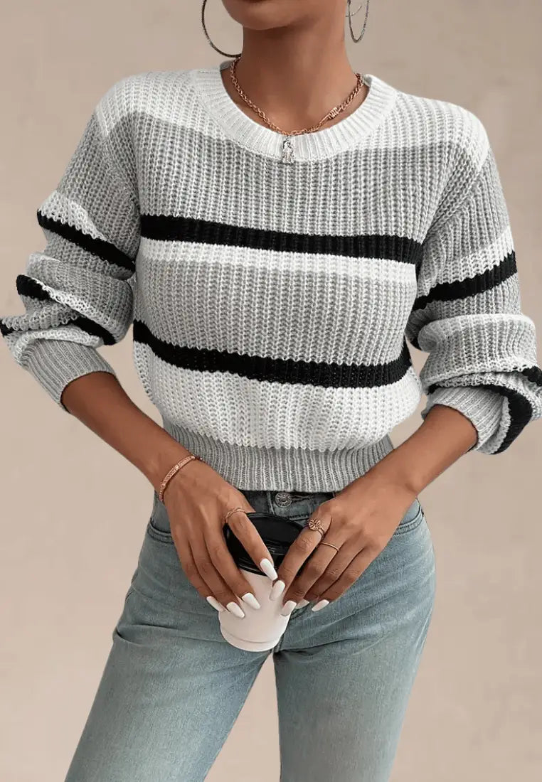 Biało-szary sweter damski w czarne pasy z okrągłym dekoltem