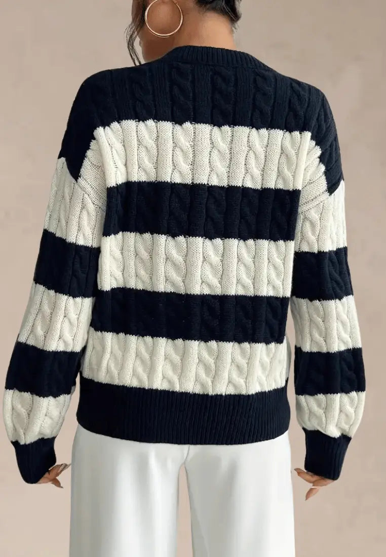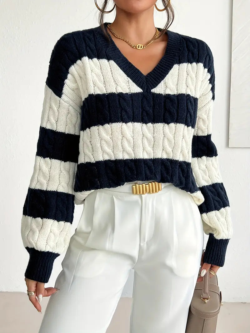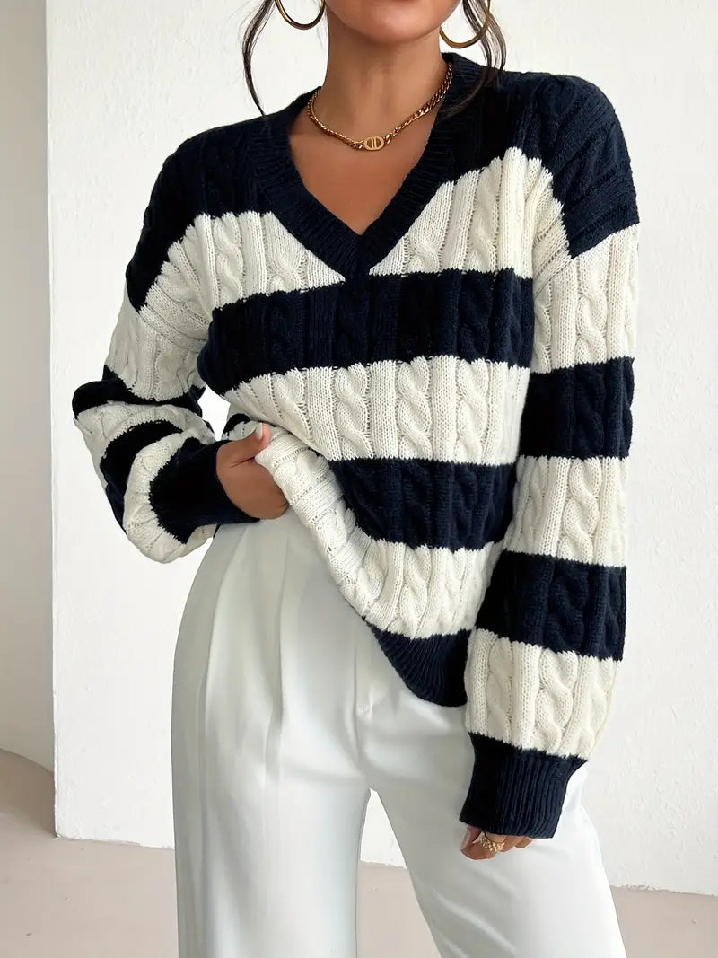 Podkreśl swój swobodny, a jednocześnie elegancki styl ze swetrem w szerokie granatowo-kremowe pasy z dekoltem w serek. Ten modny model łączy w sobie wygodę miękkiej dzianiny z ponadczasowym wzorem, który zawsze pozostaje na topie.