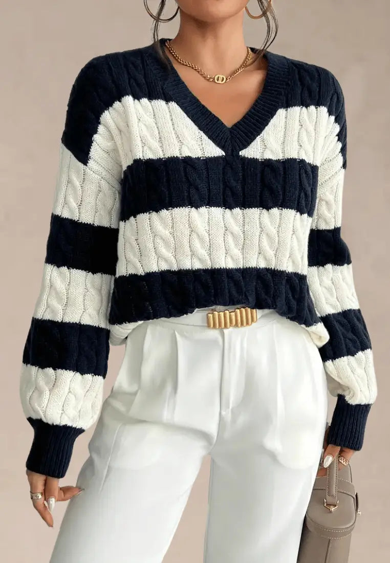 Granatowo-kremowy sweter damski w paski z dekoltem V