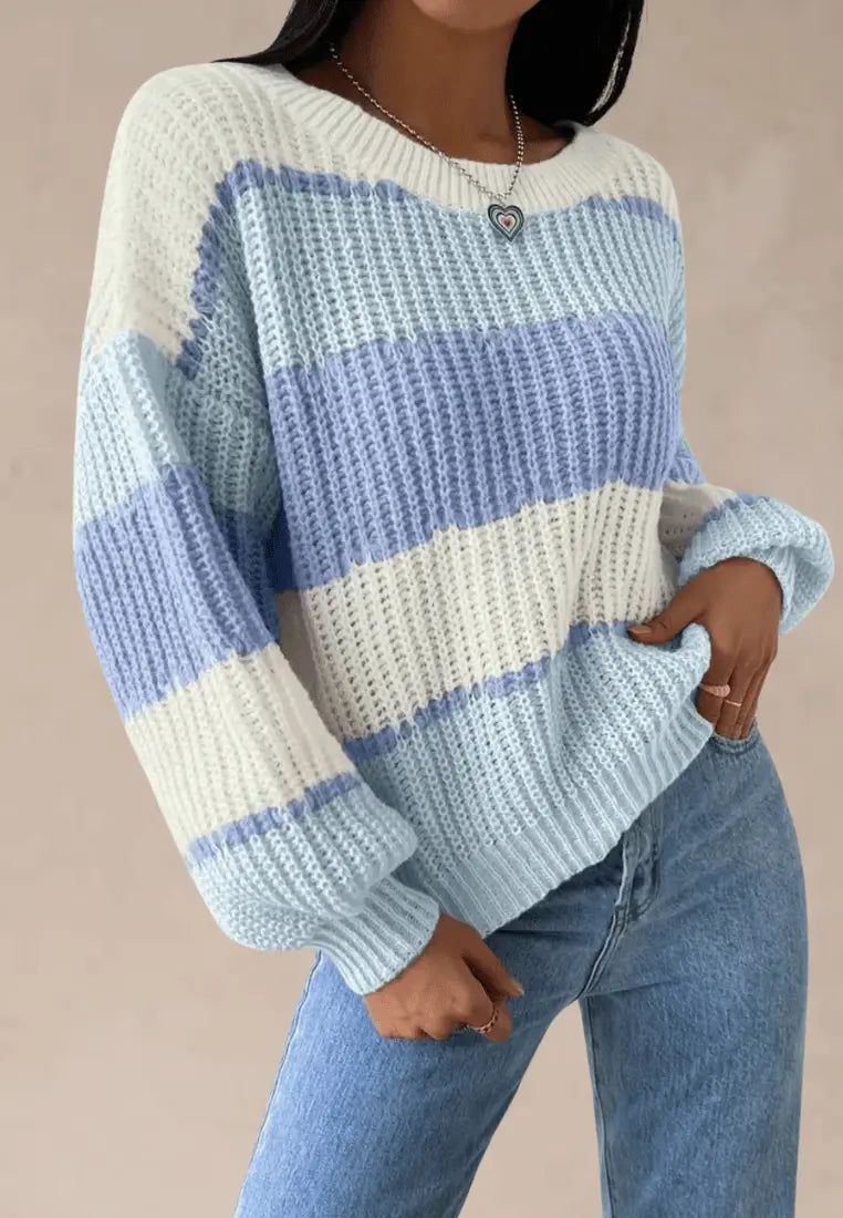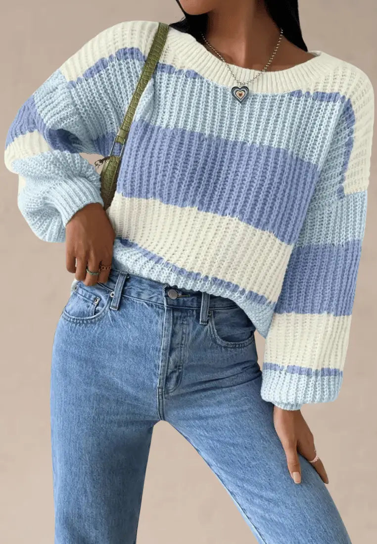 Ten sweter w szerokie pasy to połączenie casualowego luzu i ponadczasowego stylu. Wykonany z miękkiej, przyjemnej w dotyku dzianiny, zapewnia komfort noszenia przez cały dzień. Harmonijne połączenie szarości, granatu i bieli nadaje mu świeżości i uniwersalności, dzięki czemu łatwo dopasujesz go do różnych stylizacji. Luźny krój z obniżoną linią ramion gwarantuje swobodę ruchów, a ściągacz przy mankietach i dole swetra subtelnie podkreśla sylwetkę.