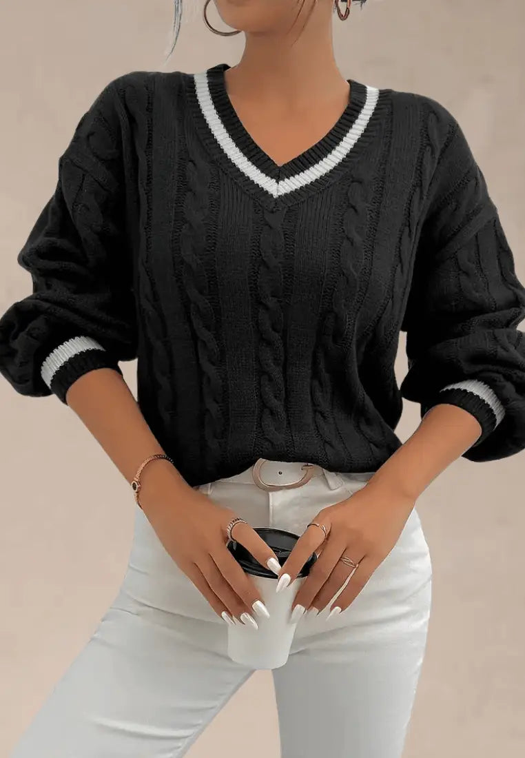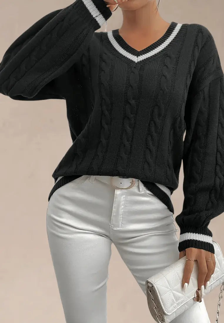 Czarny sweter damski z dekoltem V i warkoczowym splotem