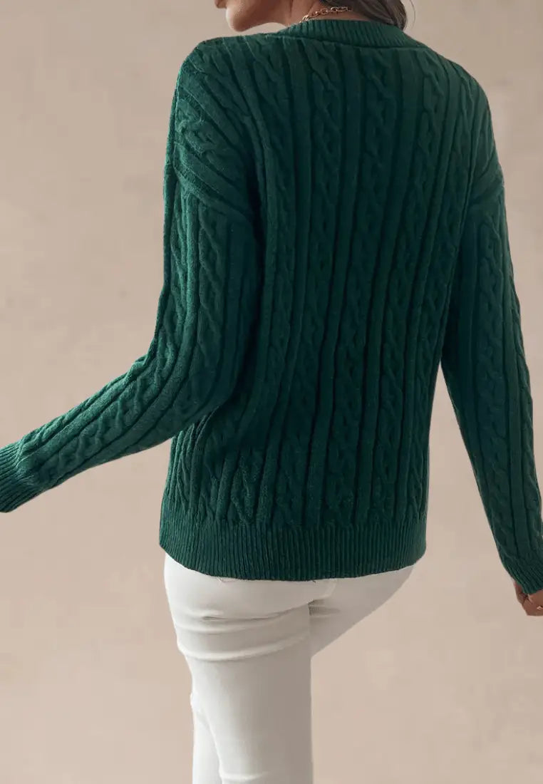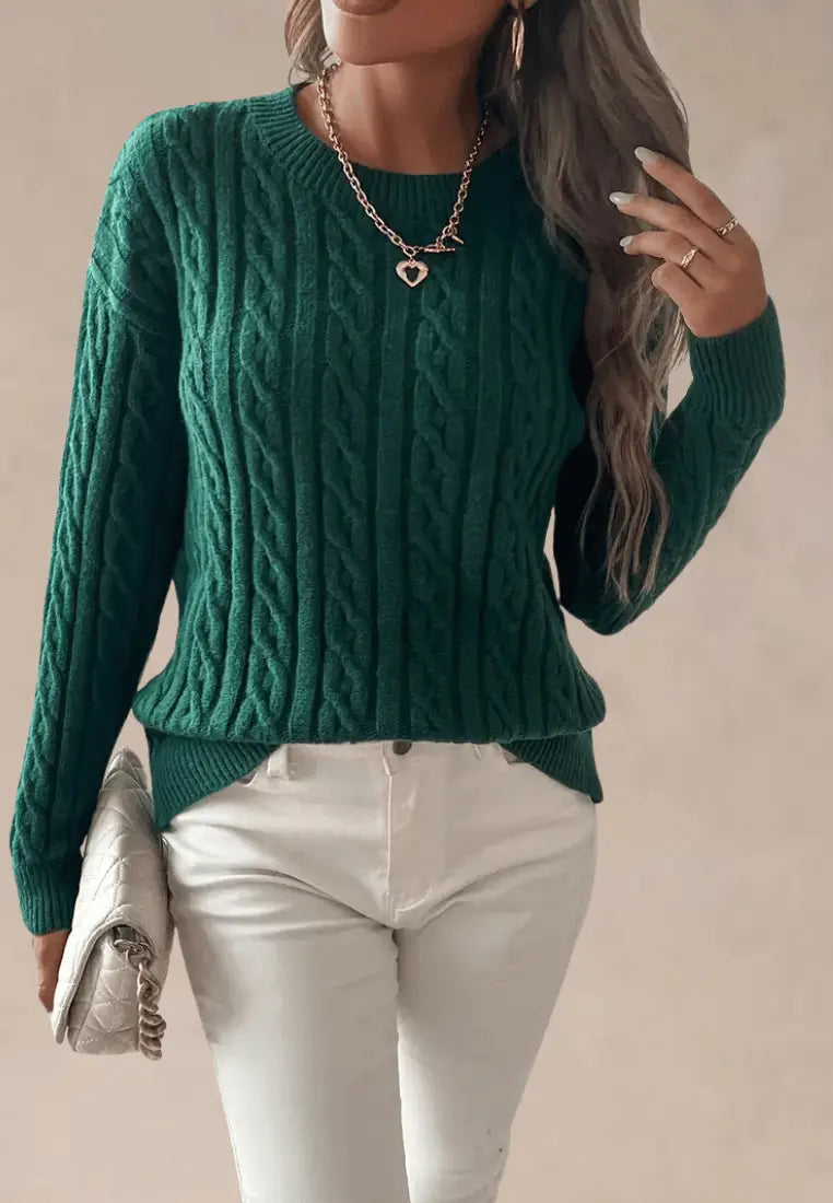 Zielony sweter damski z warkoczowym splotem i okrągłym dekoltem