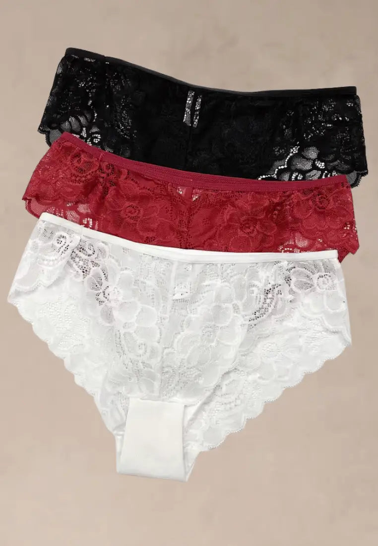 Zestaw 3 szt. figi majtki damskie koronkowe bawełniane czarne, białe i czerwone