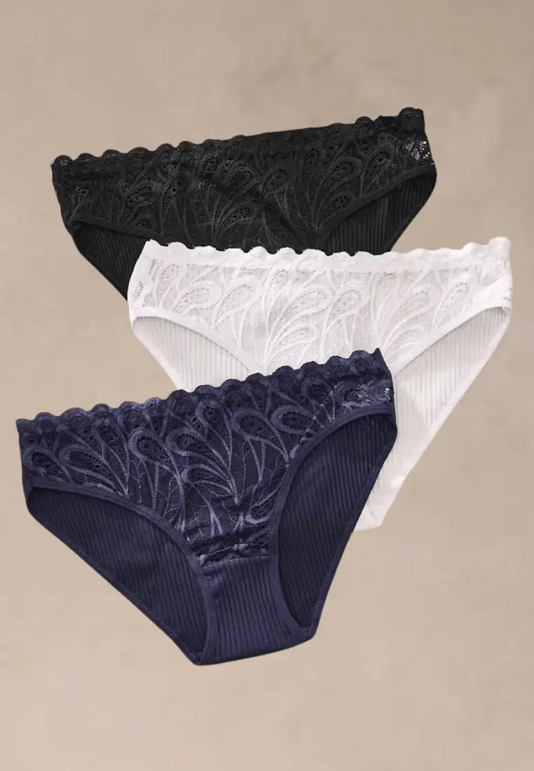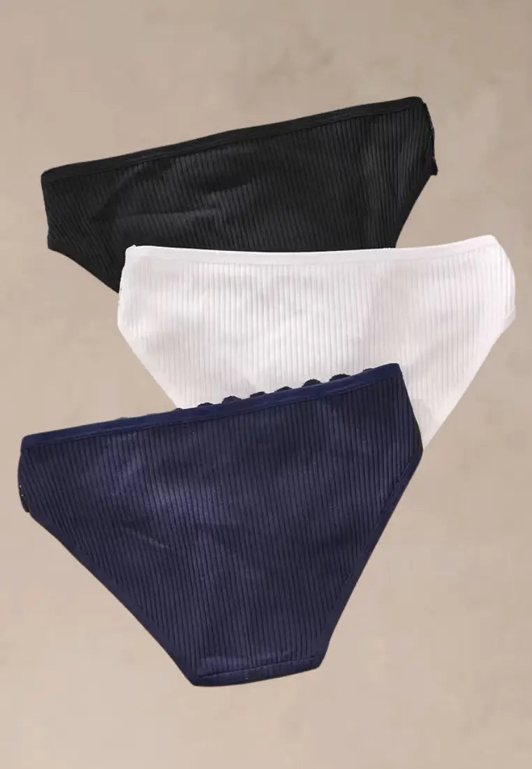 Wyjątkowy i zaawansowany zestaw trzech par damskich z delikatnych, oddychającej bawełny z delikatnej tkaniny dekoracyjnej. Klasyczne kolory — czerń, biel i granat — połączenie stylowy komplet, który sprawdzał się w każdej kobiecej garderobie.