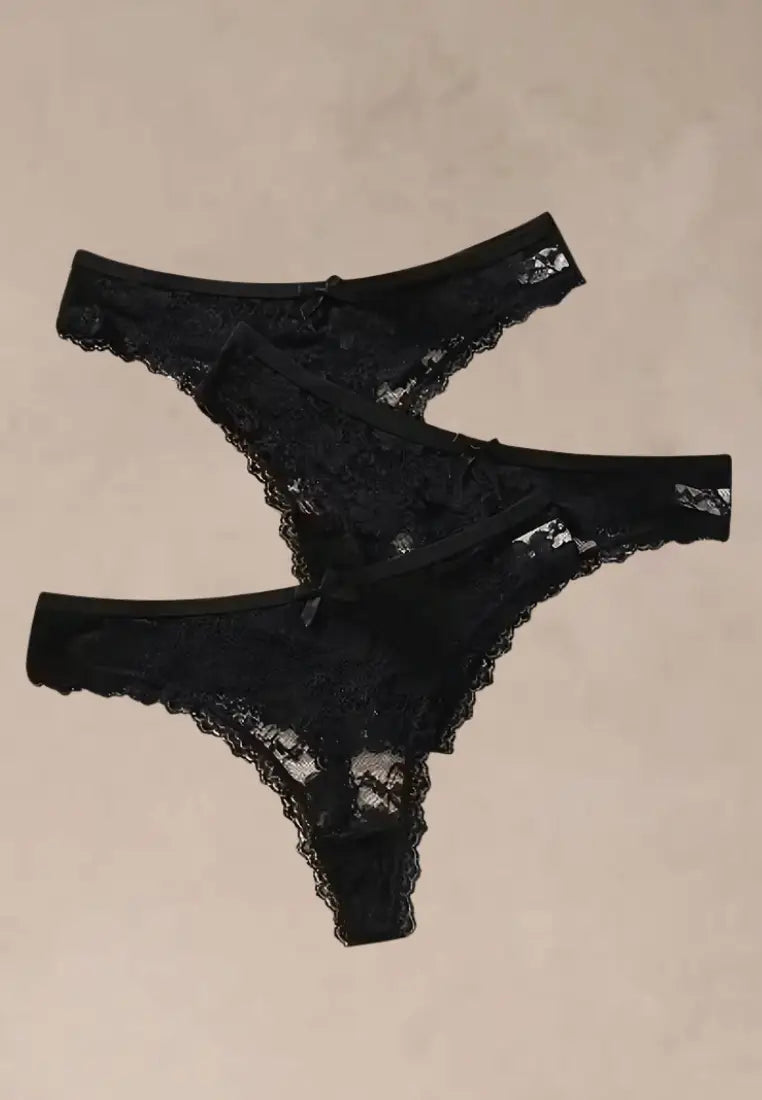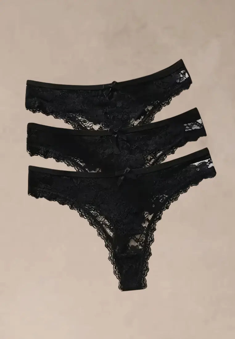 Zmysłowy i elegancki zestaw trzech par stringów damskich wykonanych z miękkiej, oddychającej bawełny z dodatkiem delikatnej koronki. Klasyczna czerń w połączeniu z koronkowym wykończeniem tworzy wyjątkowo kobiecą i kuszącą bieliznę, która pięknie podkreśla sylwetkę.