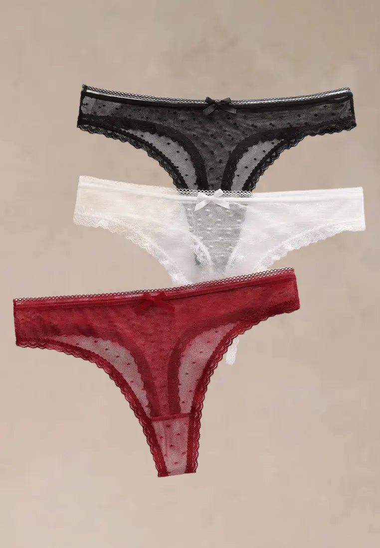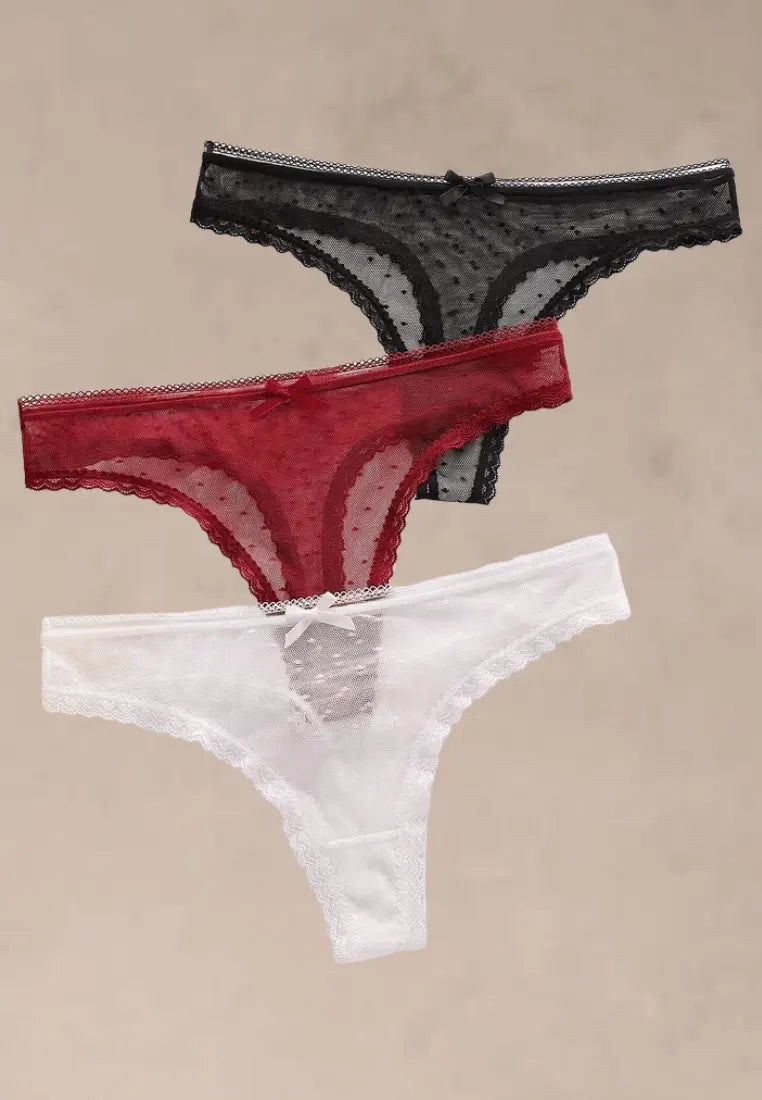 Zmysłowy i elegancki zestaw trzech par stringów damskich wykonanych z miękkiej, oddychającej bawełny z dodatkiem delikatnej, transparentnej koronki. Połączenie klasycznej czerni, subtelnej bieli oraz uwodzicielskiej czerwieni tworzy wyjątkowo kobiecy komplet, który podkreśla sylwetkę i dodaje pewności siebie.