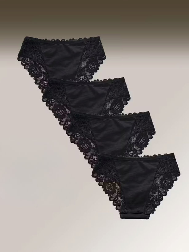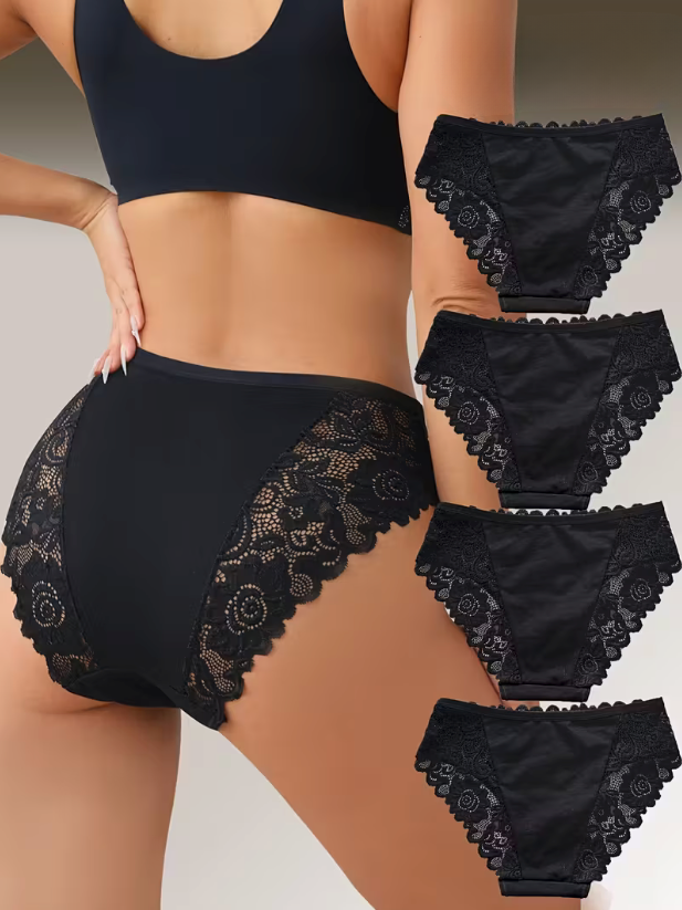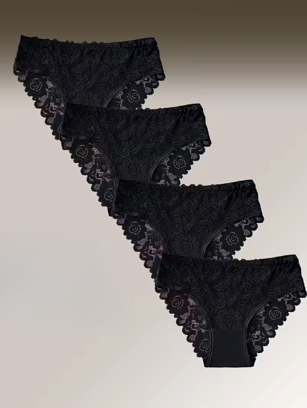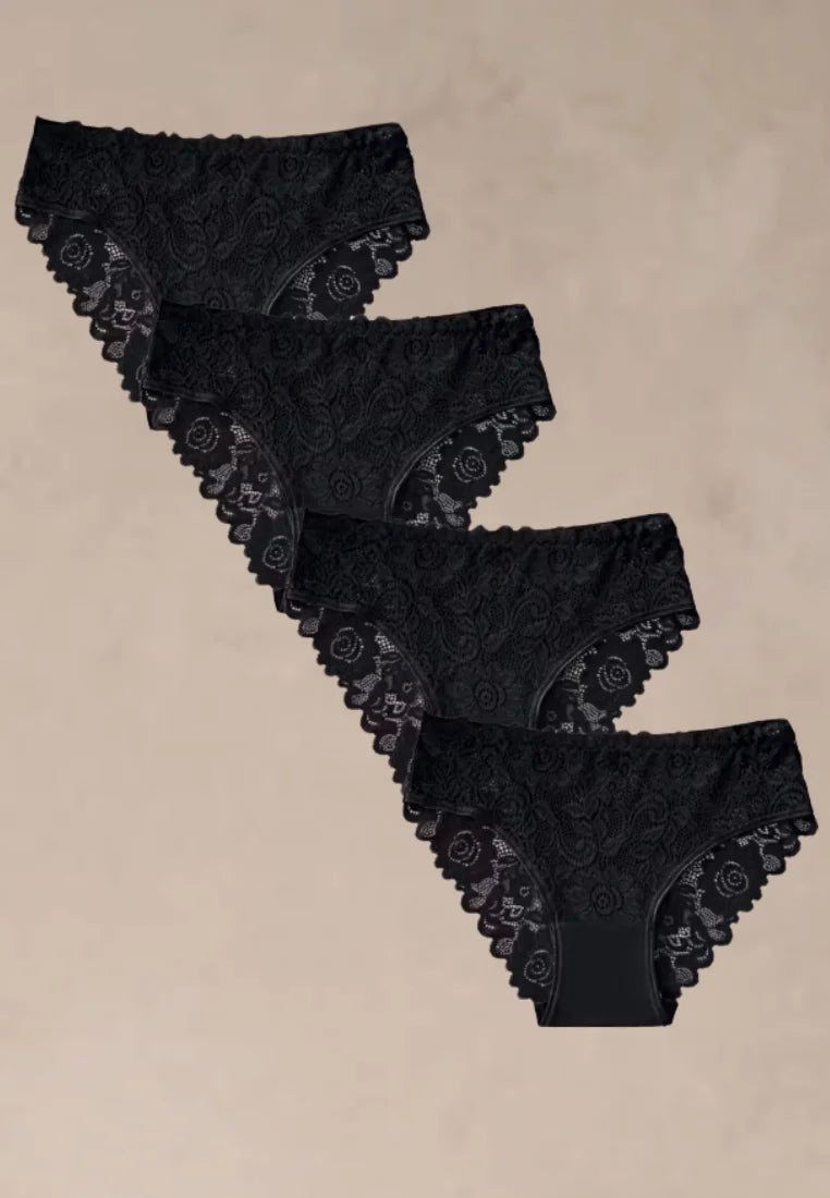 Odkryj połączenie elegancji i komfortu z zestawem 4 czarnych koronkowych fig wykonanych w 95% z miękkiej, oddychającej bawełny. Delikatna koronka o kwiatowym wzorze nadaje im zmysłowego charakteru, a elastyczna konstrukcja gwarantuje idealne dopasowanie do sylwetki.