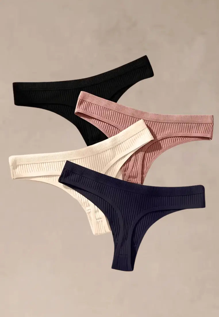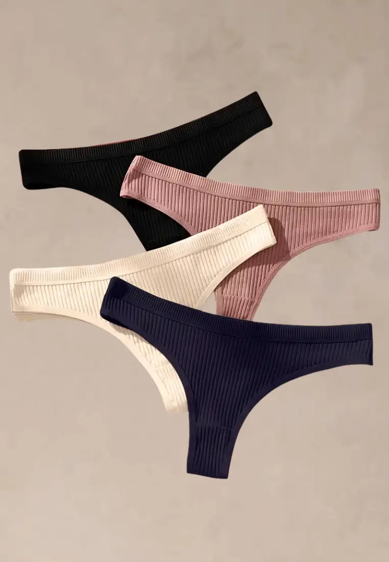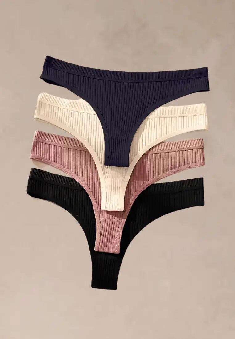 Nowoczesny i wygodny zestaw czterech par stringów damskich wykonanych z miękkiej, oddychającej bawełny o prążkowanej strukturze. Naturalny materiał zapewnia maksymalny komfort noszenia oraz doskonałe dopasowanie do sylwetki.