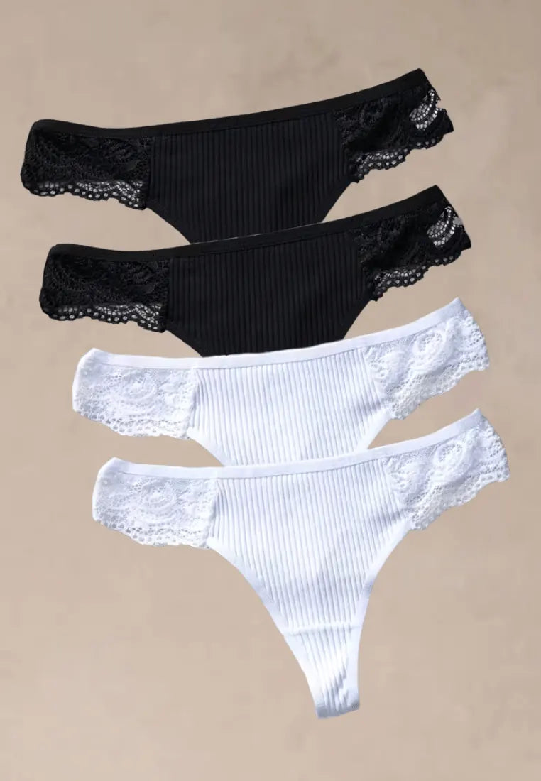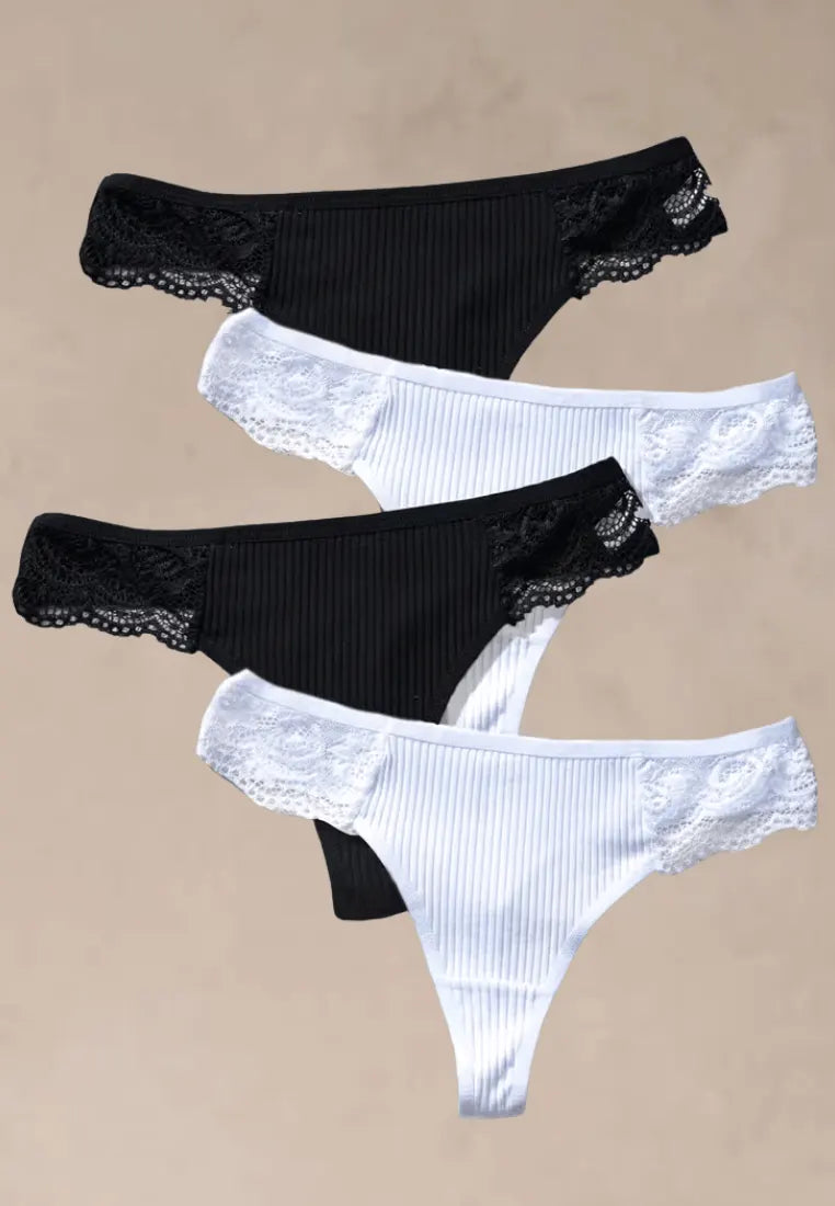 Elegancki i nowoczesny zestaw czterech par stringów damskich wykonanych z miękkiej, oddychającej bawełny z dodatkiem zmysłowej koronki. Połączenie klasycznej czerni i czystej bieli tworzy ponadczasowy komplet, który doskonale sprawdzi się w każdej kobiecej garderobie.