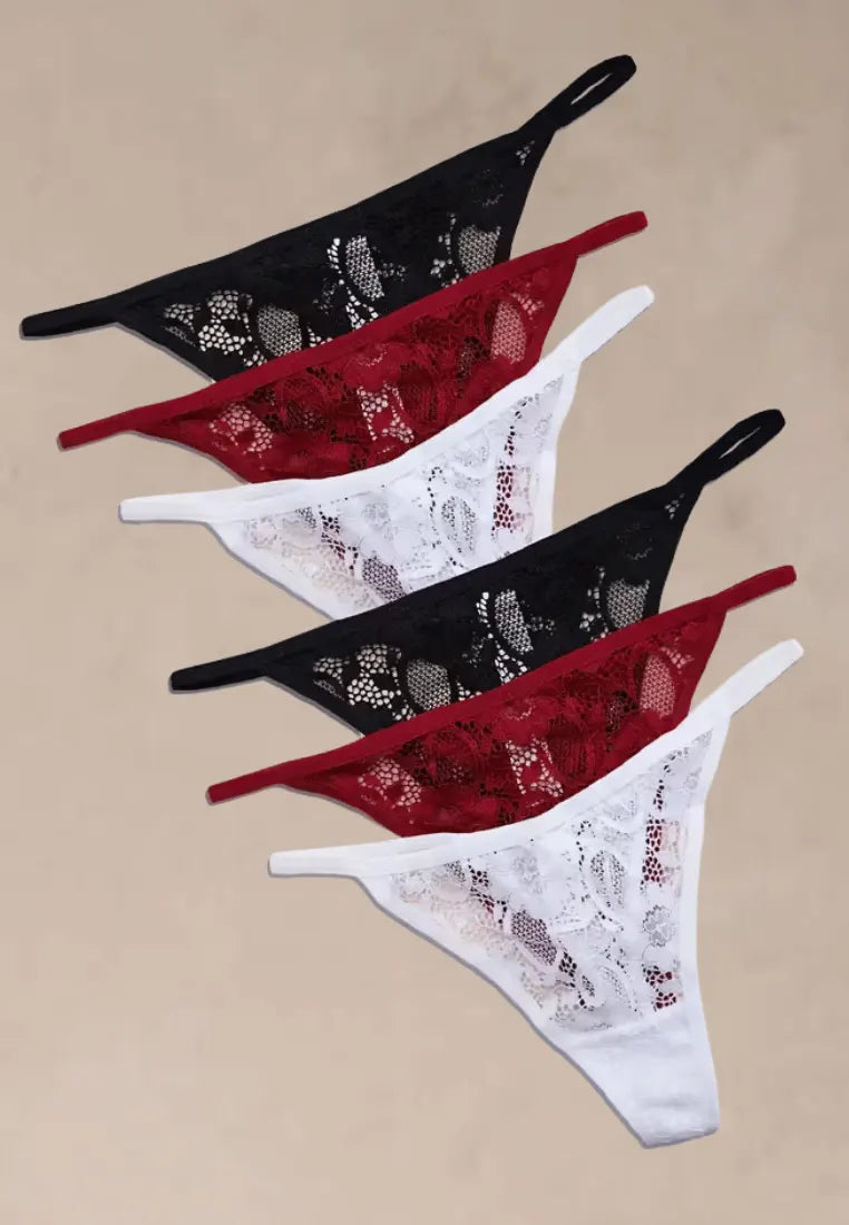 Zmysłowy i elegancki zestaw sześciu par stringów damskich wykonanych z miękkiej, oddychającej bawełny z dodatkiem delikatnej, ażurowej koronki. Połączenie klasycznej czerni, czystej bieli oraz uwodzicielskiej czerwieni tworzy wyjątkowo kobiecy komplet, który pięknie podkreśla sylwetkę.