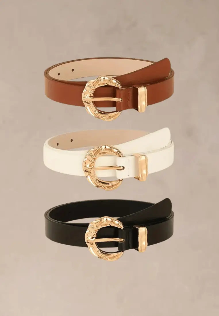 Zestaw 3 szt. damskich pasków w kolorze brązowym, białym i czarnym ze złotą klamrą