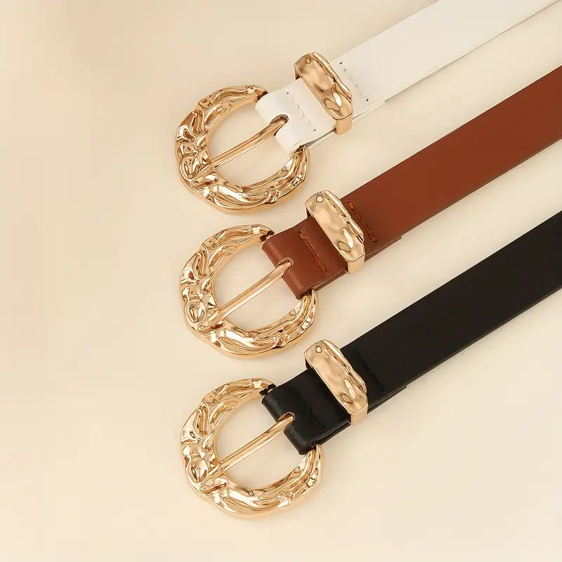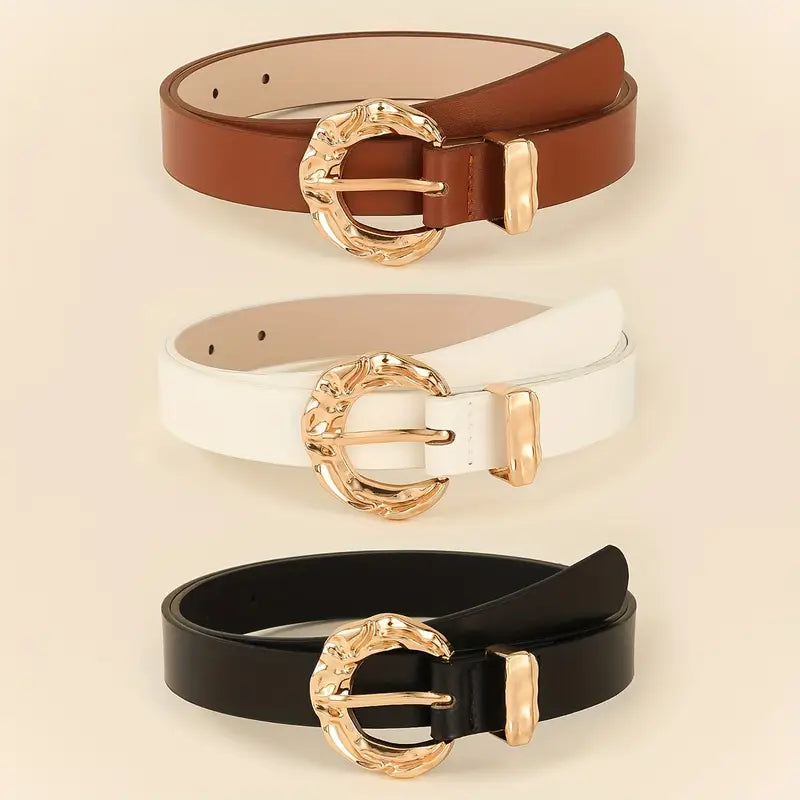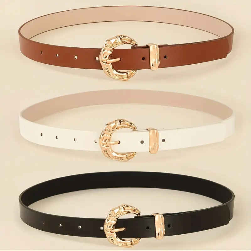Podkreśl swój styl z eleganckim zestawem damskich pasków w trzech ponadczasowych kolorach: brązowym, białym i czarnym. Każdy pasek został ozdobiony unikatową złotą klamrą o nieregularnym kształcie, która nadaje całości wyjątkowego charakteru. Wykonane z trwałego materiału paski są nie tylko praktyczne, ale także efektowne – idealne zarówno do codziennych, jak i eleganckich stylizacji.