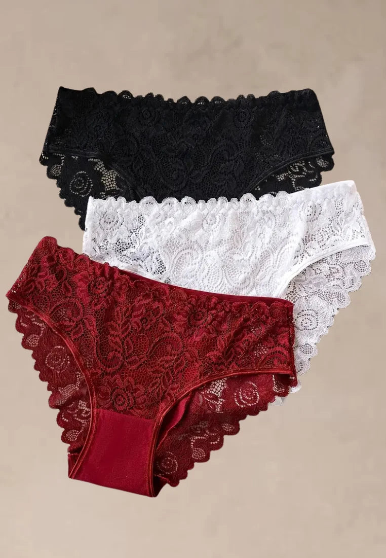Zestaw 3 szt. figi majtki damskie bawełniane koronkowe w czerni, bieli i czerwieni