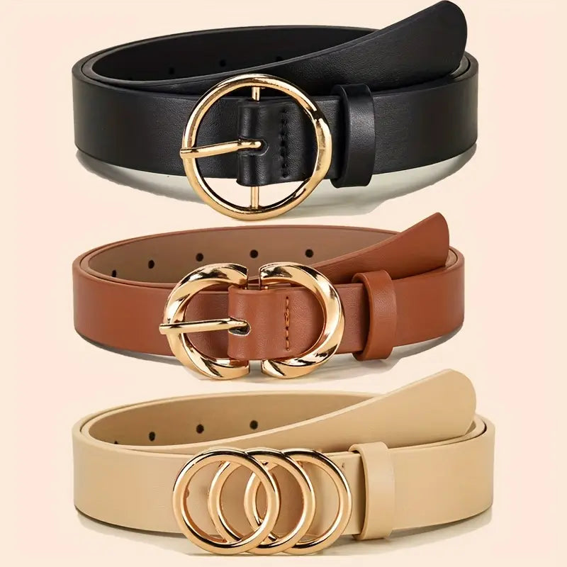 Podkreśl swój styl z zestawem pasków w kolorze czarnym, brązowym i beżowym, ozdobionych efektownymi złotymi klamrami o wyjątkowych kształtach. To eleganckie i modne dodatki, które sprawią, że każda stylizacja nabierze charakteru.