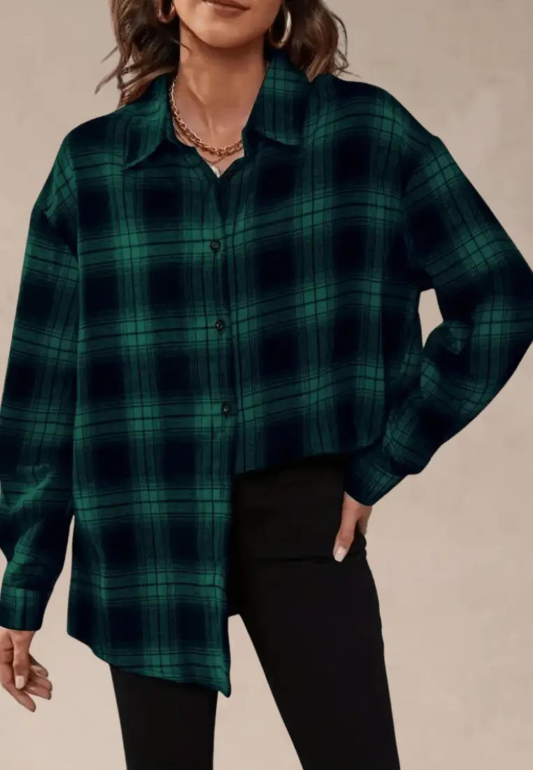 Zielona koszula damska flanelowa w kratę z kołnierzykiem i długim rękawem