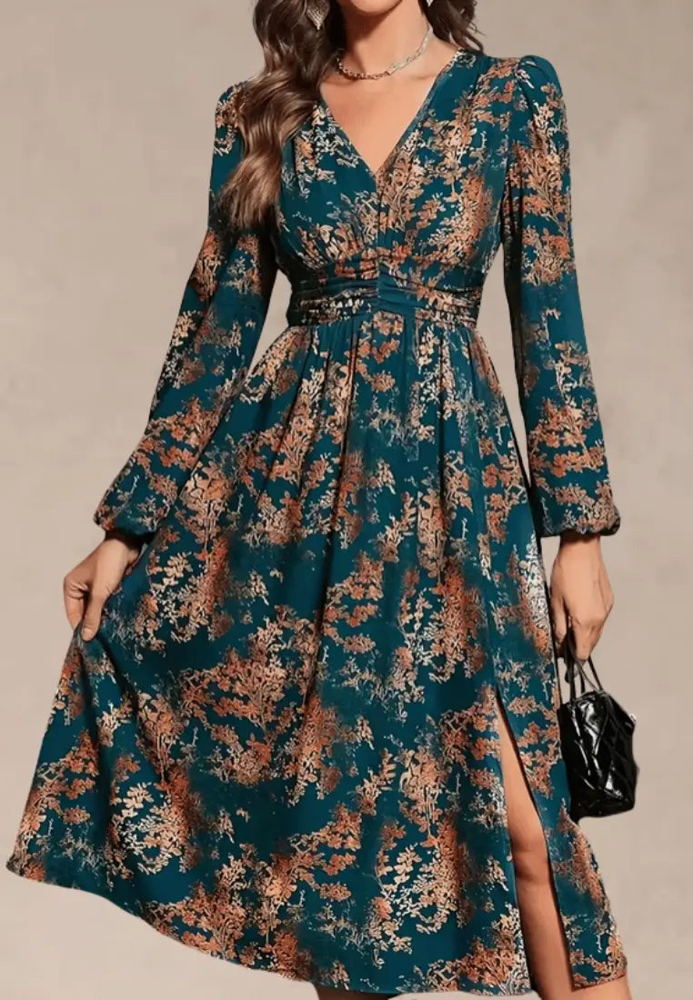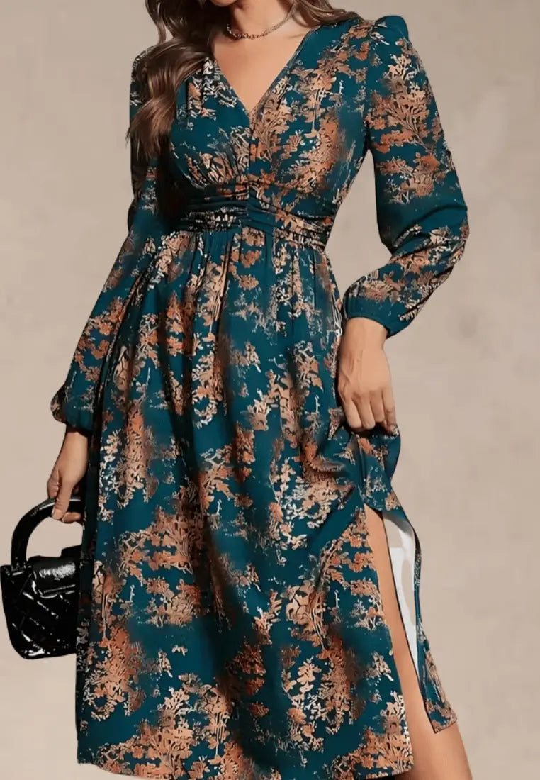 Zielona sukienka midi w kwiatowy wzór z rozcięciem i długim rękawem