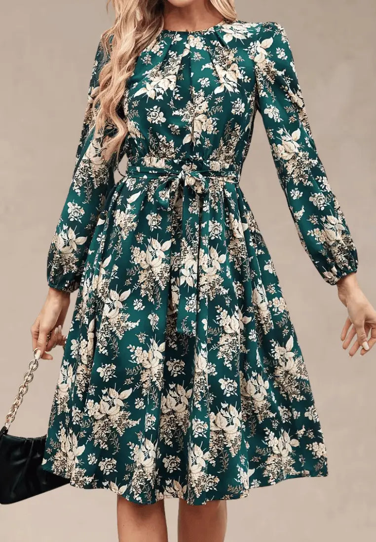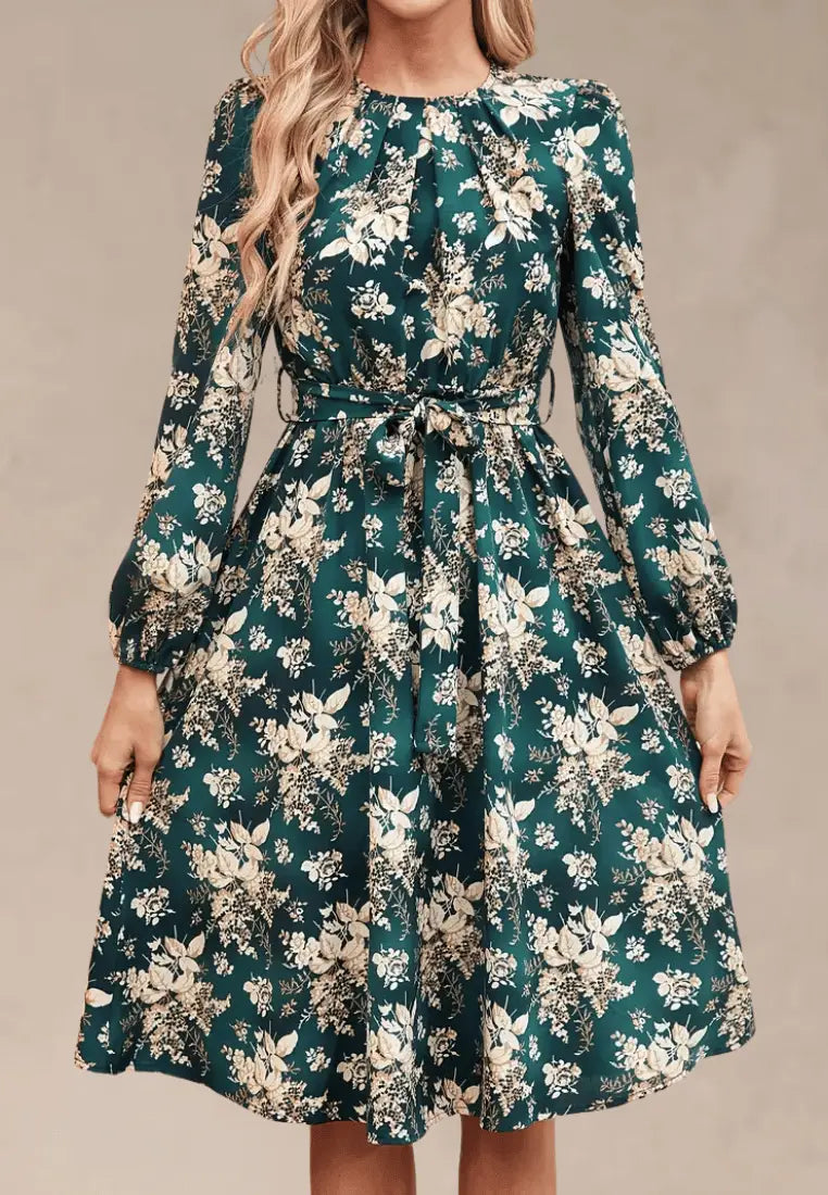 Zielona sukienka midi w kwiaty z paskiem i długim rękawem