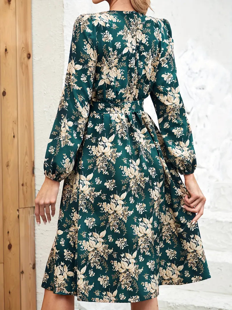 Długie, lekko bufiaste rękawy z marszczeniem przy mankietach nadają sukience romantycznego charakteru, a długość midi sprawia, że jest to uniwersalny wybór na wiele okazji – od codziennych spacerów po eleganckie spotkania. Zielone tło w połączeniu z beżowym kwiatowym motywem tworzy efektowny, a zarazem stonowany look.